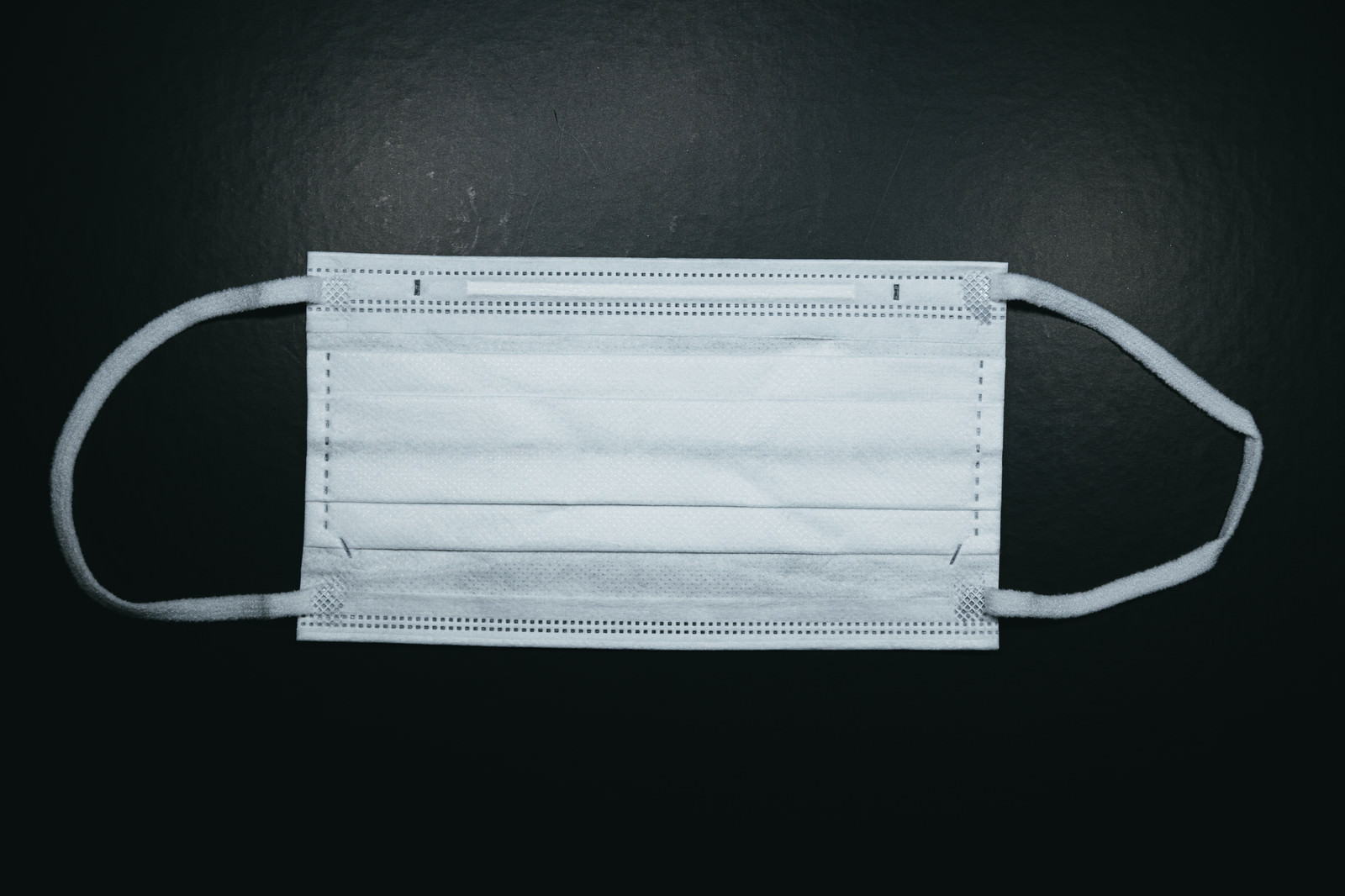 白い不織布マスクの写真素材です。耳掛け用のゴムひもが付いた一般的な使い捨てマスクが黒い背景に単体で置かれており、マスク全体がはっきり見えます。ウイルス感染予防や花粉症対策、インフルエンザ予防、風邪対策などの医療関連コンテンツ制作に最適です。