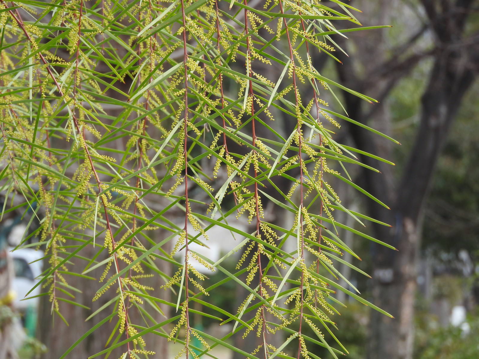 アカシアフロリバンダの枝の写真素材です。細い緑の葉が密集して垂れ下がり、光に透ける繊細な樹形を呈する、マメ科植物の優雅な姿をとらえています。ガーデニングや植物図鑑、自然をテーマにしたデザイン制作などにおすすめです。