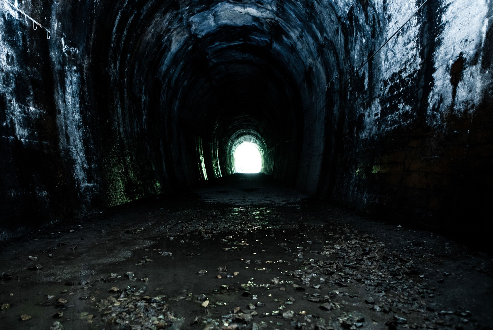 JR福知山線廃線敷の不気味なトンネルの写真素材です。暗いトンネル内部から奥へ進むと、先に明るい出口が小さく見え、光と暗さの対比により深い恐怖感が強調されています。肝試しや恐怖系コンテンツ、廃線探索関連の記事制作などに最適です。