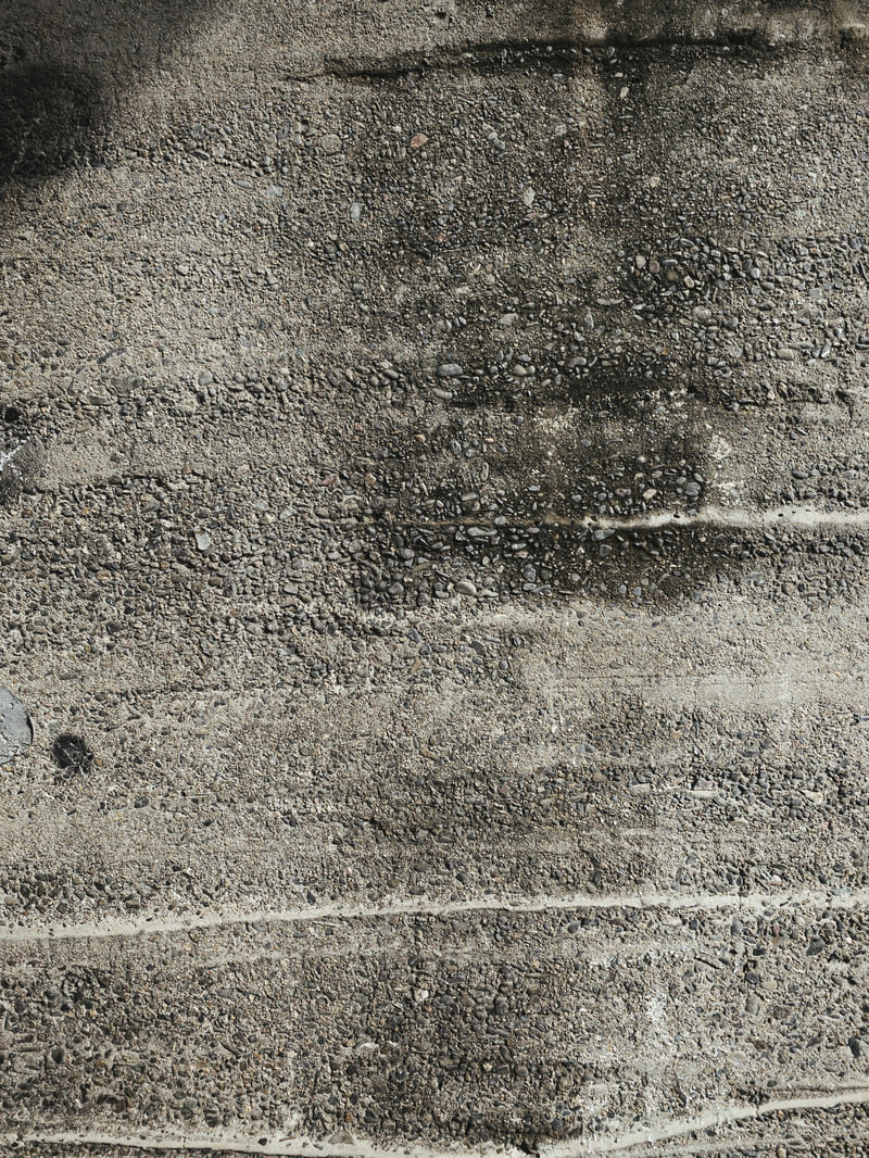 シミが残るアスファルト路面の写真素材です。グレーの硬い路面に濃淡のあるシミや汚れが広がり、ざらついた質感とコンクリートの凹凸が見られ、経年劣化による自然な風合いを呈しています。背景デザインやテクスチャー素材などにおすすめです。