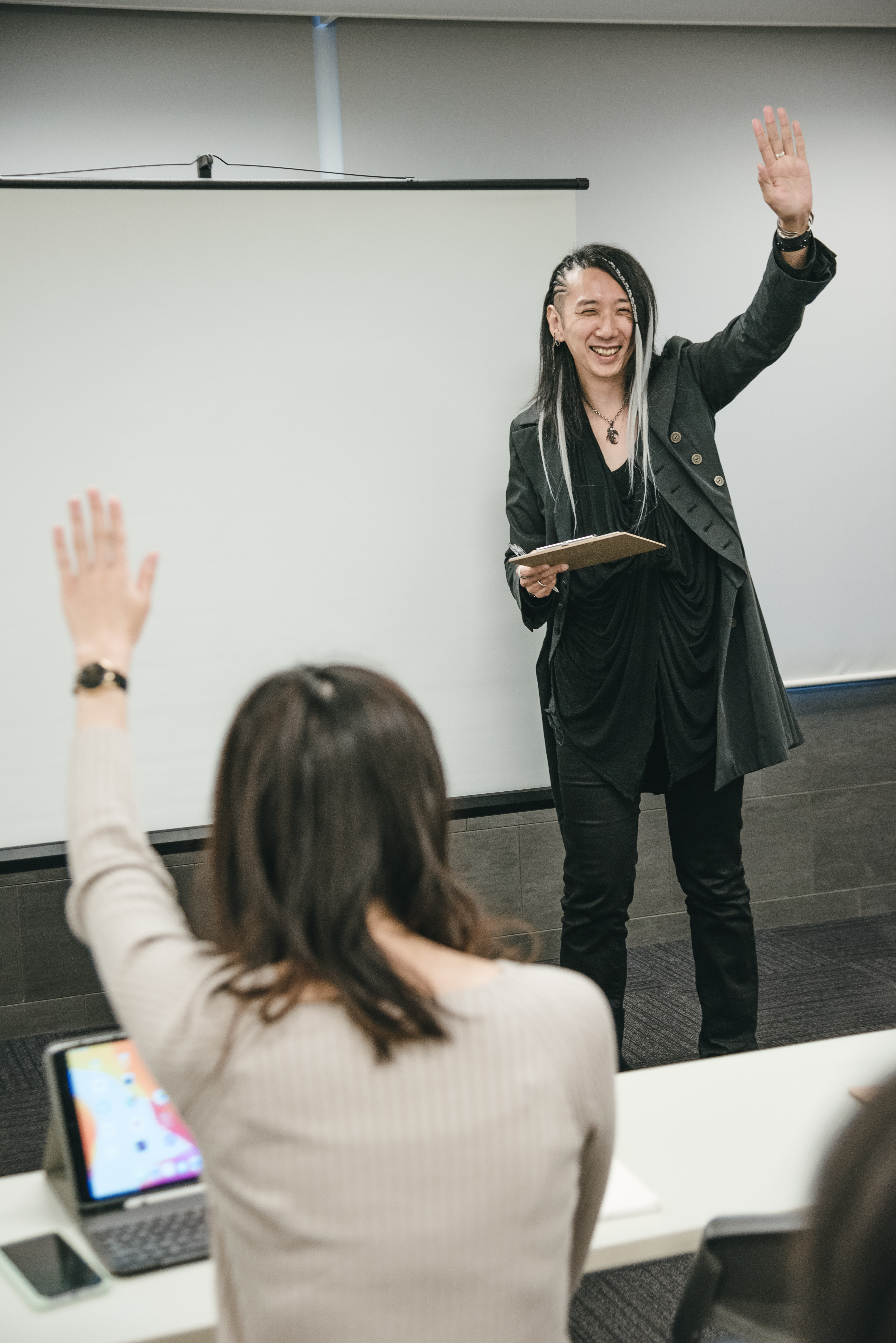 Man asking seminar participants to raise their hands