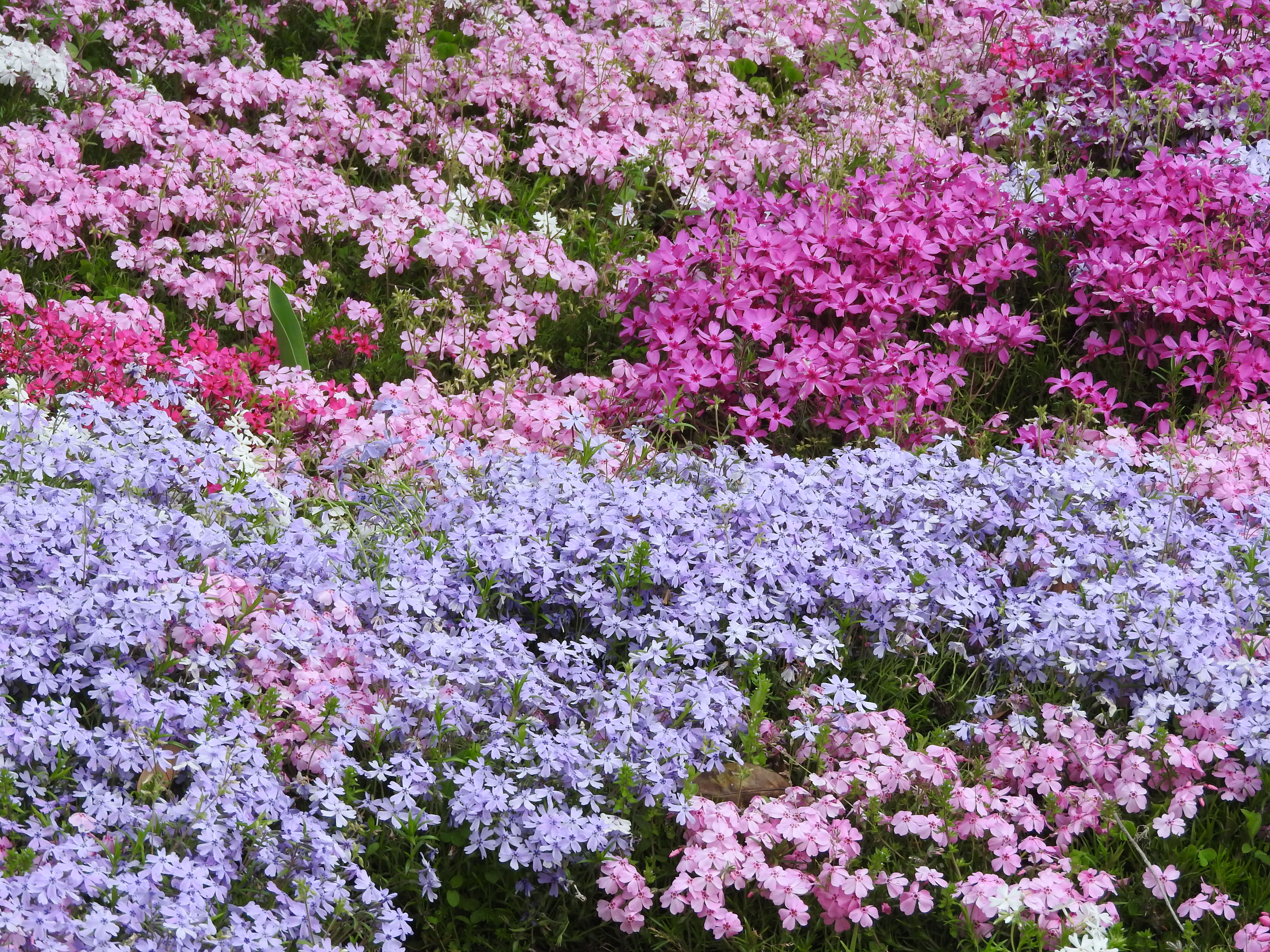 屋外の花壇に密集して咲くシバザクラの写真素材です。手前に青紫、奥にピンクの小さな花が一面に広がり、春らしいグラデーションを見せている。春のデザインや観光PR、ポストカード制作などにおすすめです。