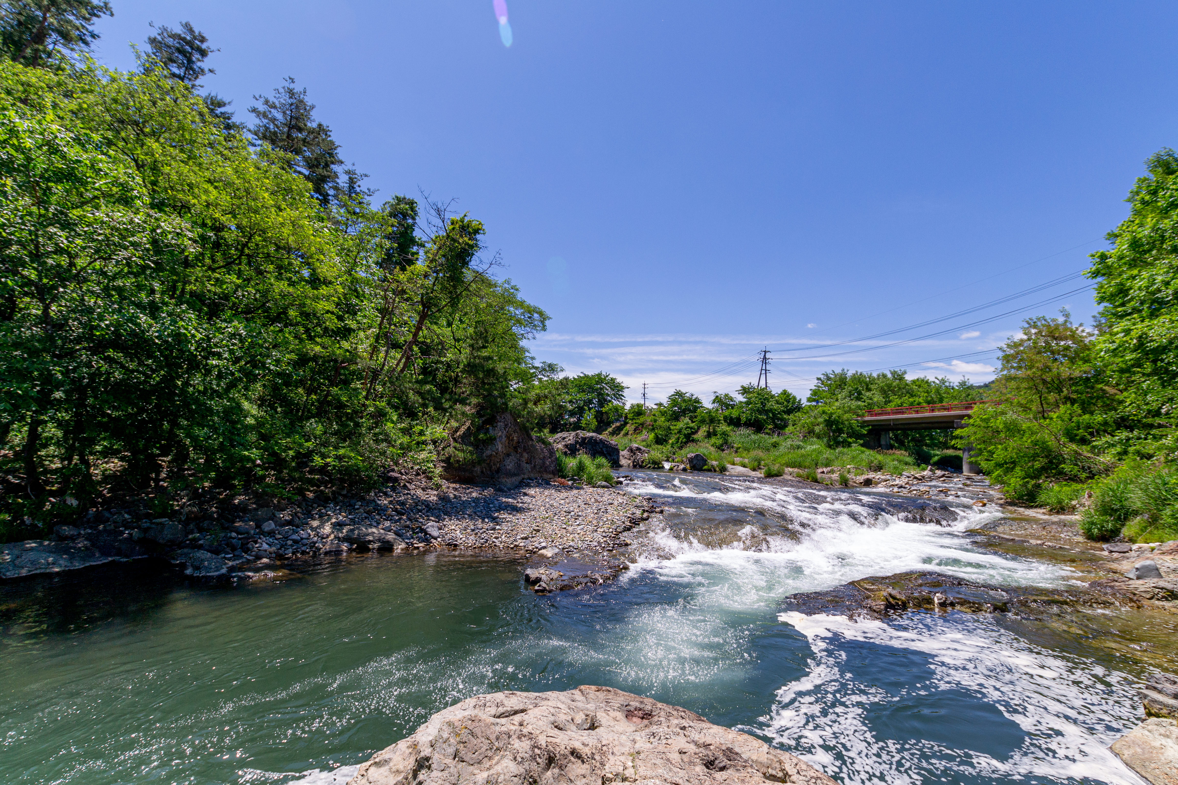 依田川飛魚が生息する仙ヶ淵の写真素材です。青空の下、緑に囲まれた岩場を透明な清流が流れ、淵を形成している長野県の景勝地で、希少な飛魚が泳ぐ貴重な自然環境が広がっています。川遊びや渓流釣り、自然景観の撮影素材としておすすめです。
