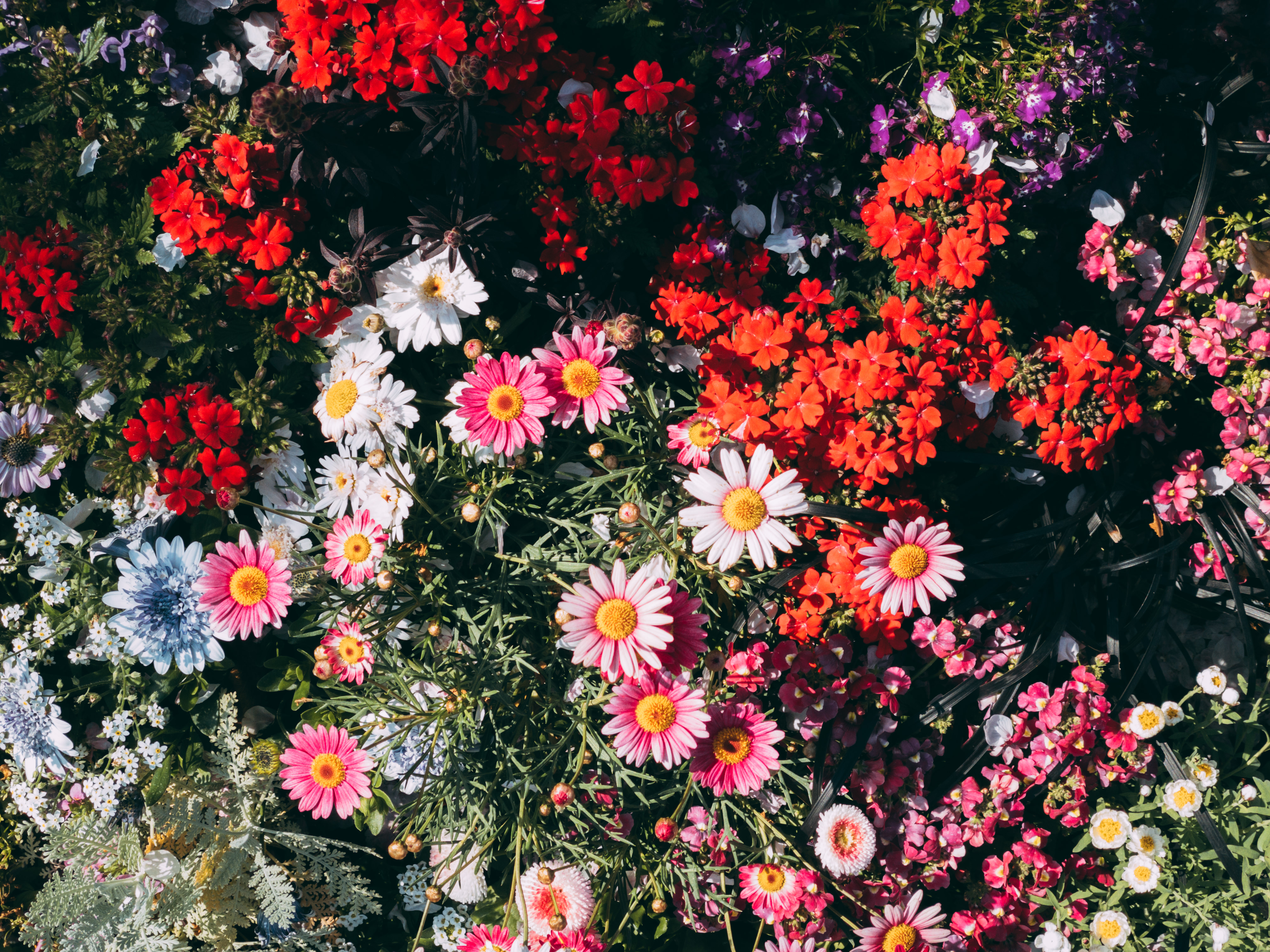 晴れた日に屋外の花壇を上から撮影した写真素材です。ピンク、白、赤など多色の花が密集して咲き、デイジーのような花が中央に並んでいる。ガーデニングや園芸関連のコンテンツにおすすめです。