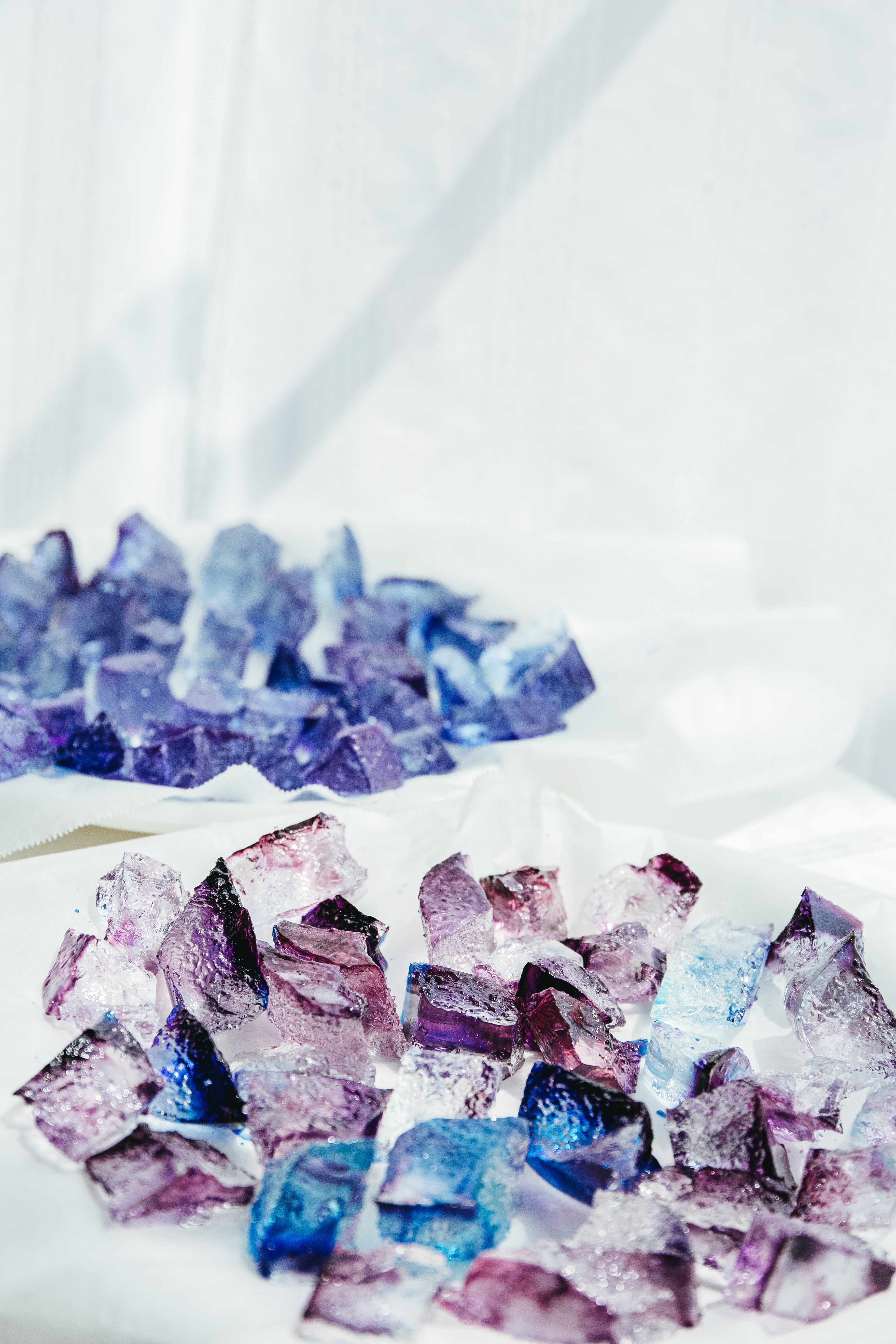 カラフルなキラキラ琥珀糖の写真素材です。赤、黄、青、緑などの透明な結晶がジュエリーのような輝きを放ち、光が当たるとプリズム効果で煌めきます。手作りスイーツのクリスタル状の美しさを表現でき、お菓子のレシピ紹介や食品関連のデザイン、スイーツ販売ページなどにおすすめです。