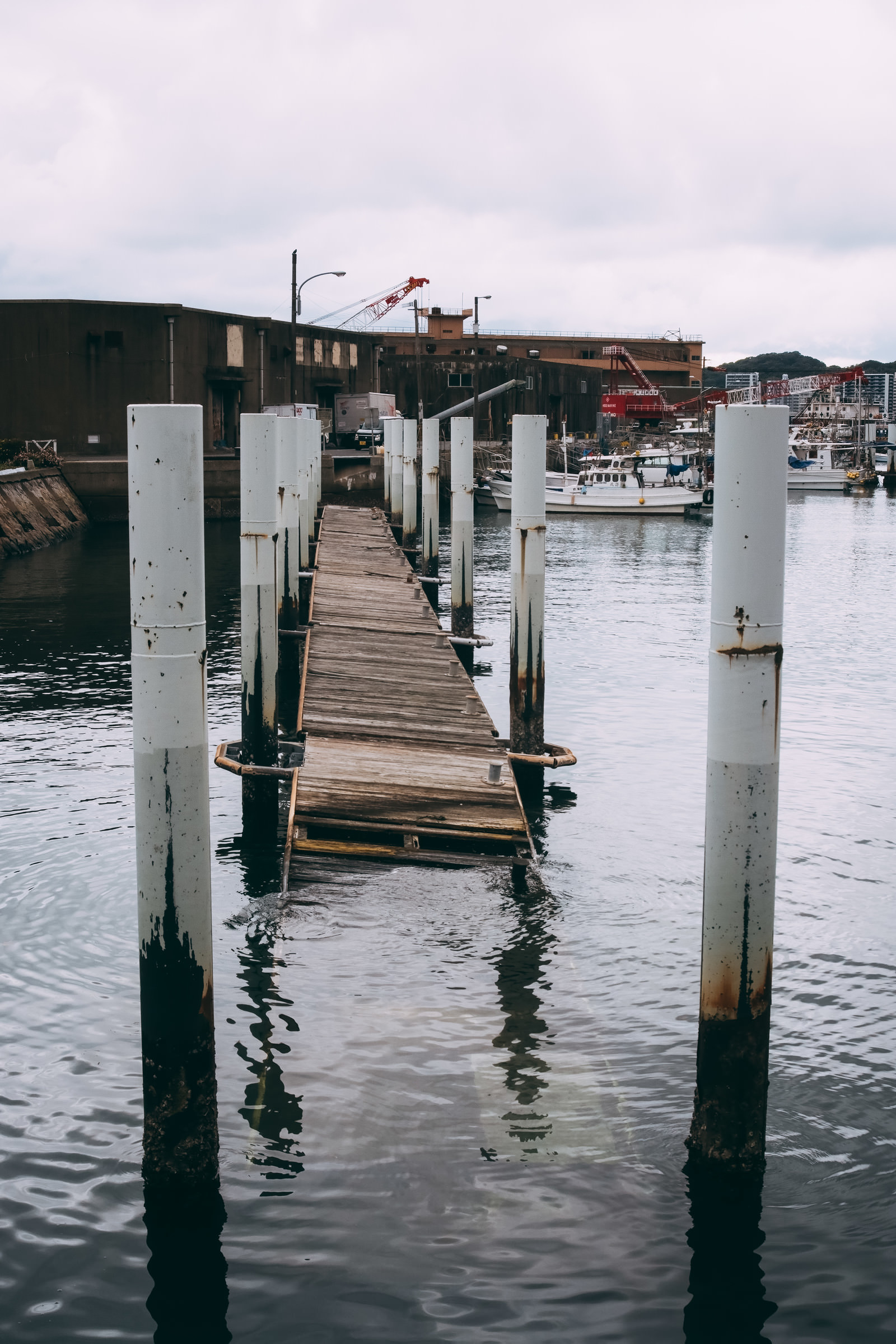 壊れてしまった桟橋の写真素材です。木製の桟橋の一部が崩れ落ち、海面に残された杭が立っており、木製部材の劣化と腐食が進行している状態が確認できます、破損と老朽化が顕著に見られ、港湾施設の経年変化を物語っています。建築・インフラ関連のコンテンツにおすすめです。
