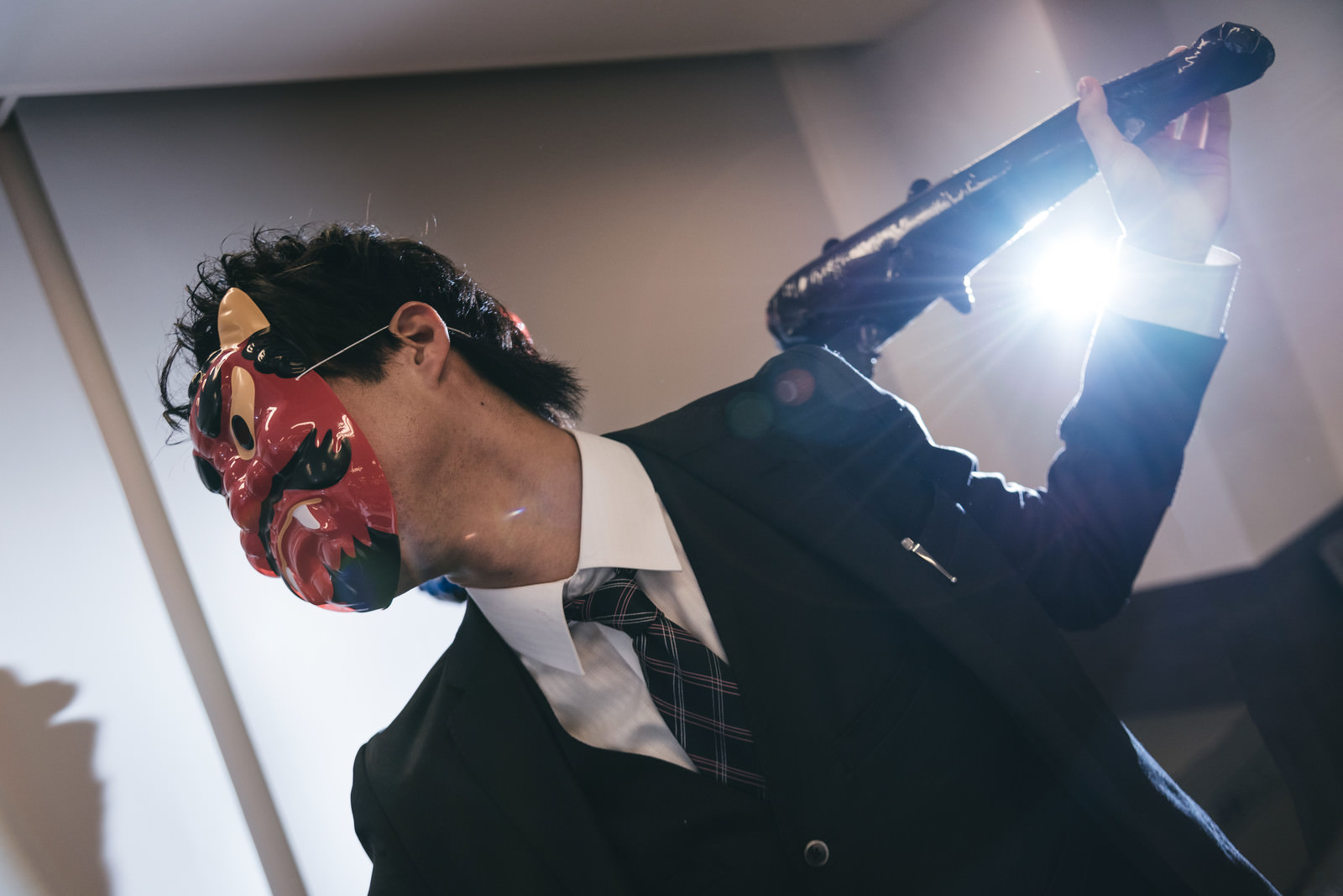 棍棒を持った鬼役の会社員の写真素材です。スーツを着た男性が棍棒を振り上げるポーズをとり、迫力のある表情と動きで節分の鬼役を演じています。節分イベントや企業の季節行事、ビジネス関連のコンテンツ制作などにおすすめです。