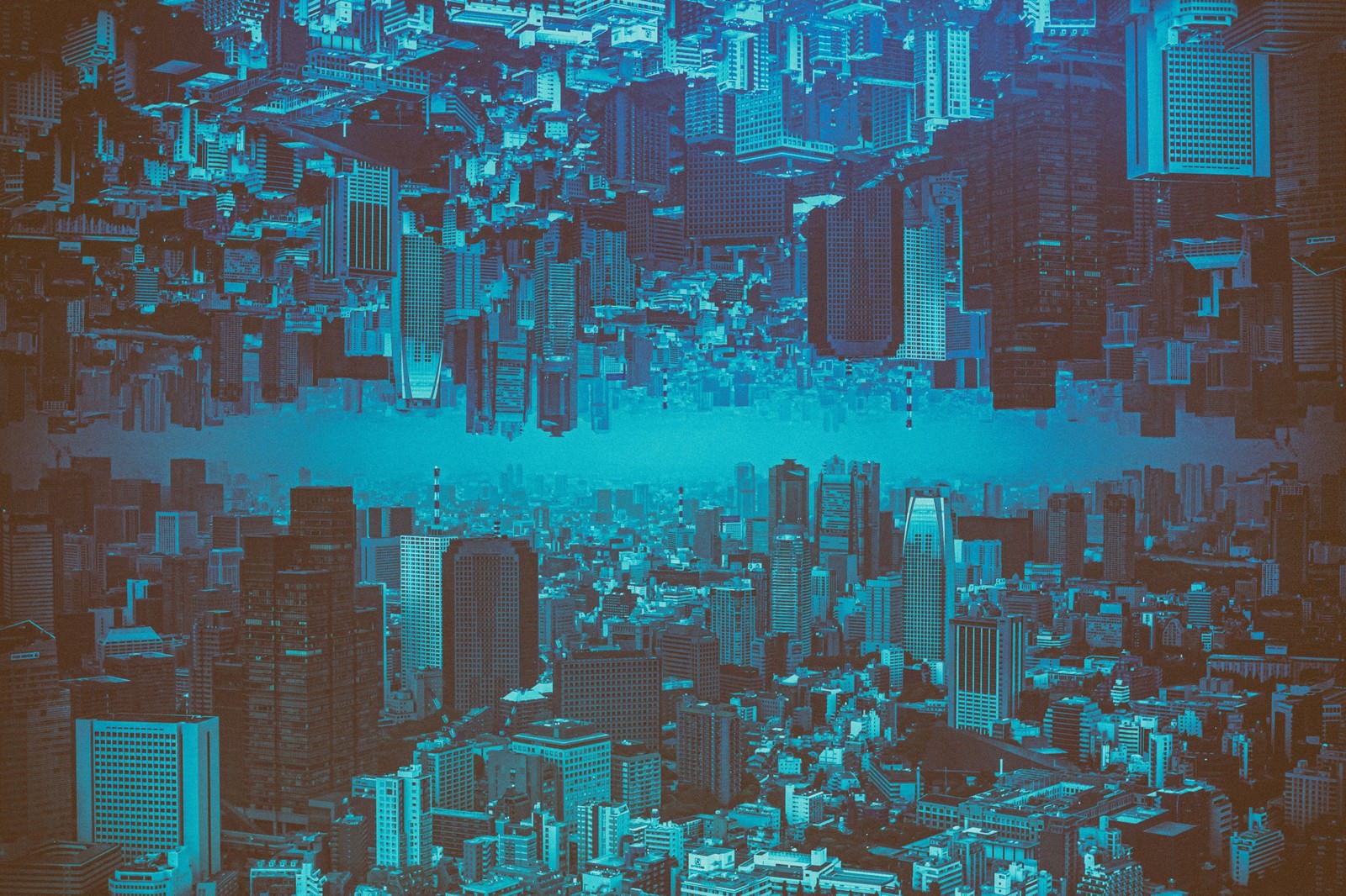 天地が逆転した都市景観の写真素材です。青いトーンで統一された高層ビルと異なる建物群を上下に配置した合成表現により、非日常的で創造的なフォトモンタージュを実現しています。ポスターやアートワーク、創作物の背景などにおすすめです。