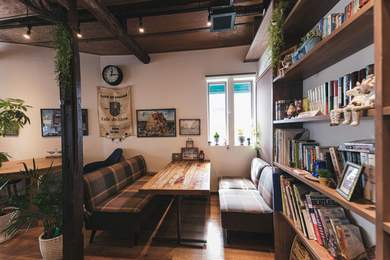 木目調のカフェのソファー席の写真素材です。温かみのある木製テーブルとダークトーンのソファが配置され、壁面に本棚と観葉植物が設置され、落ち着いた雰囲気の店内空間となっています。カフェやティーラウンジの雰囲気を表現したWebサイト制作やカフェ関連のデザイン素材として活用できます。
