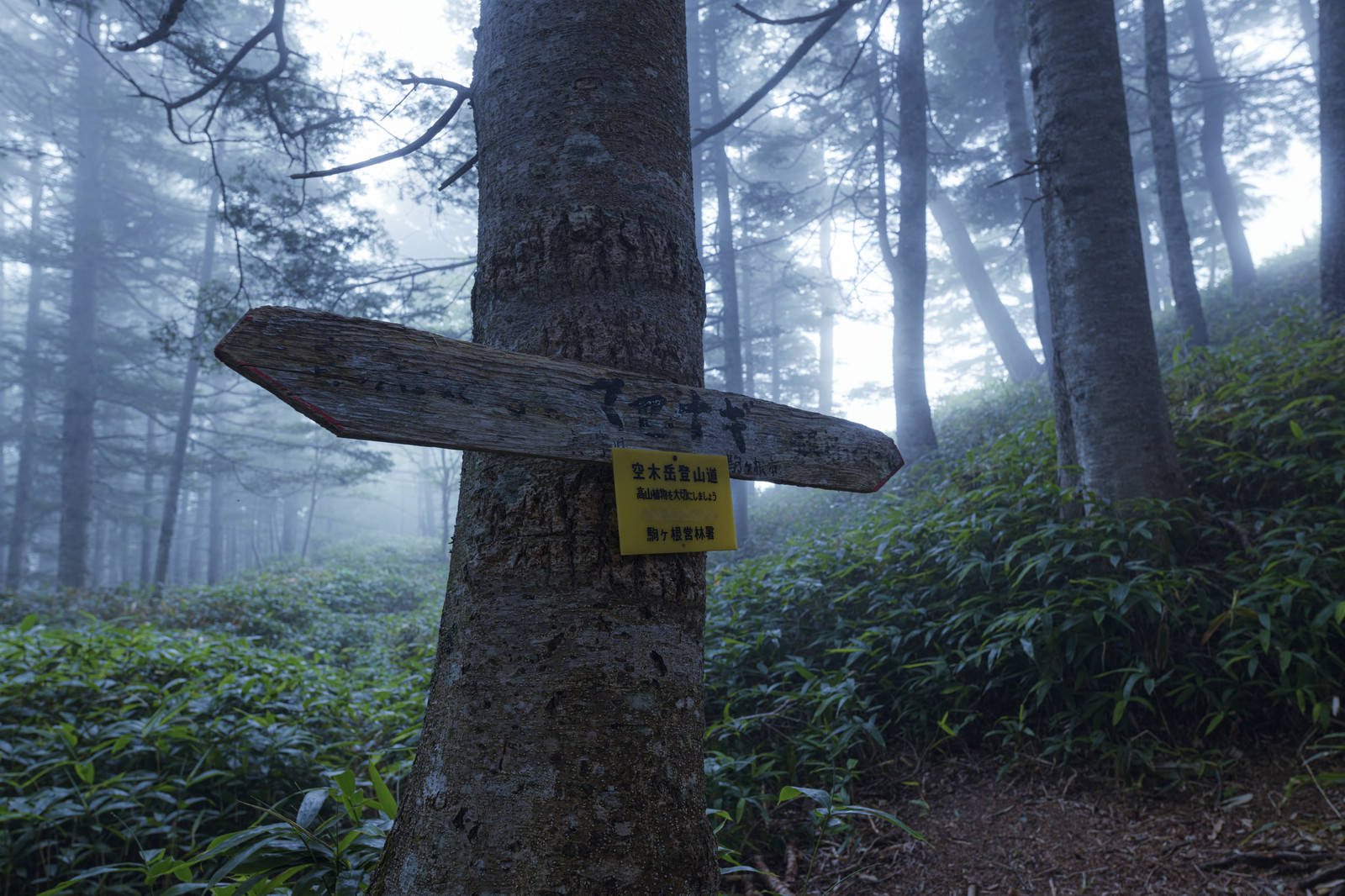 Trail Marker in Foggy Conifer Forest (Masenagi, Ikeyama Ridge)