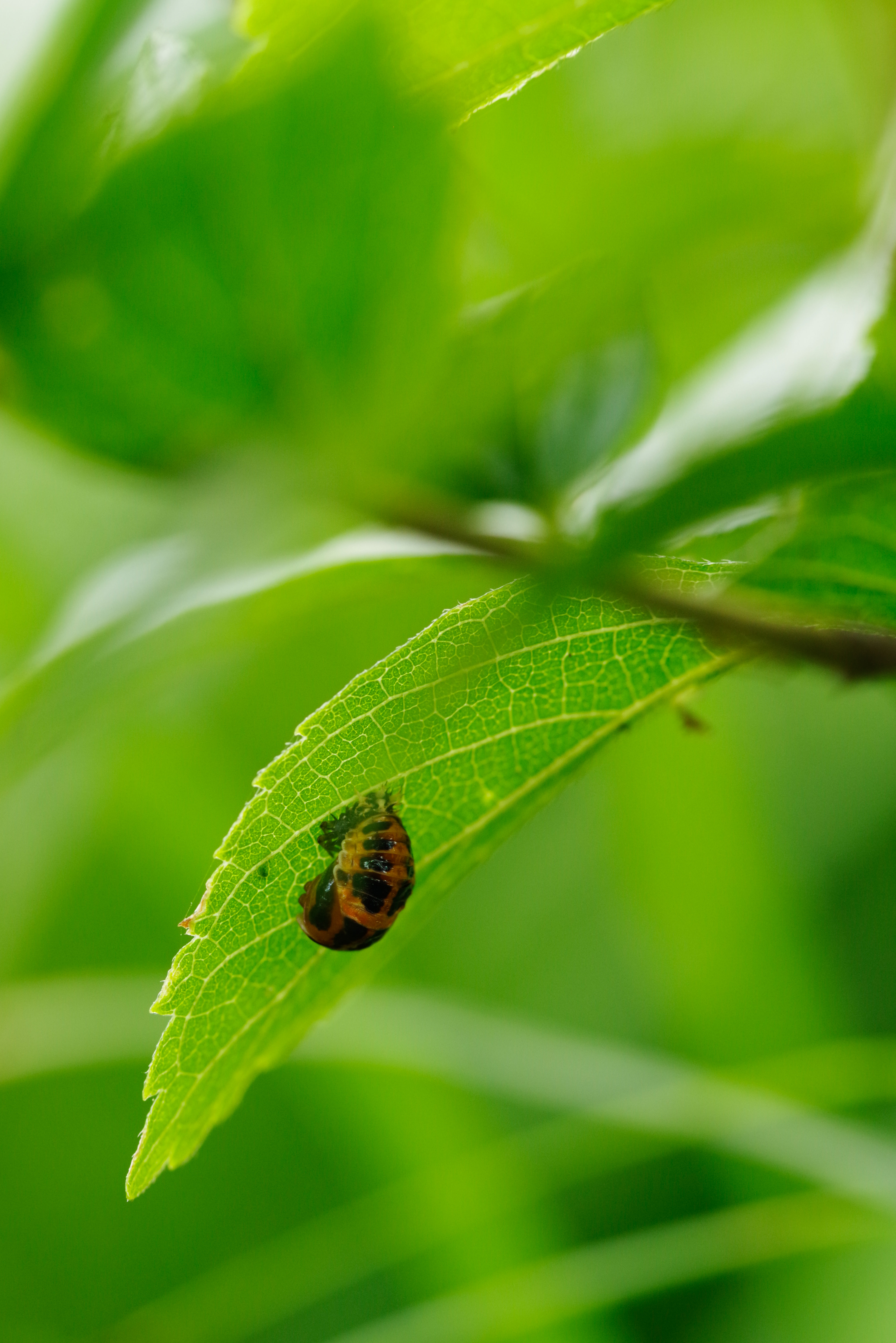 A ladybug clinging to the underside of a leaf