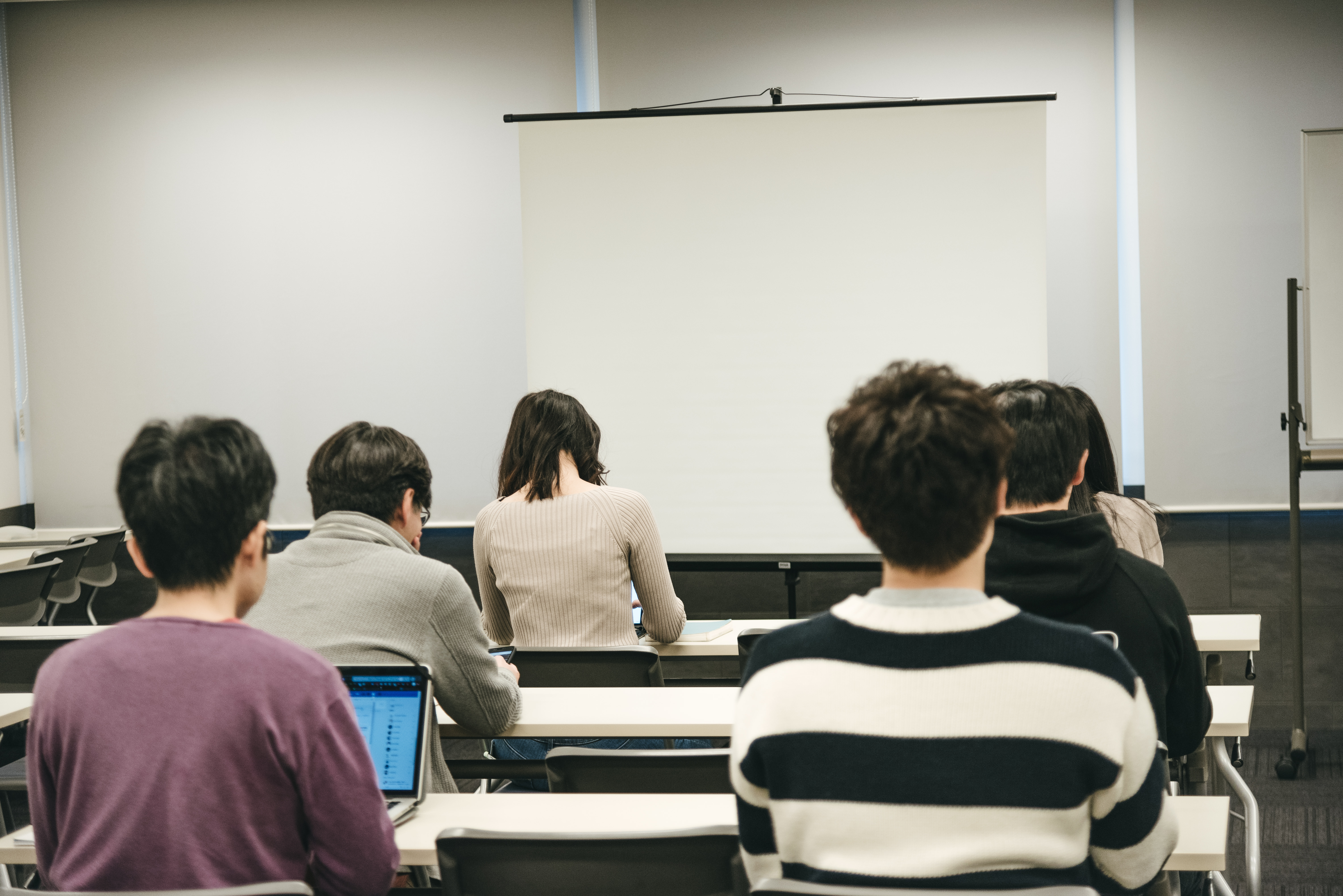 セミナーや研修に参加する人たちの後ろ姿の写真素材です。会議室で複数の参加者が前方のスクリーンに向かって着席し、講義内容に集中している様子が映し出されています。企業研修やビジネスセミナーの紹介、人材育成関連のコンテンツなどにおすすめです。