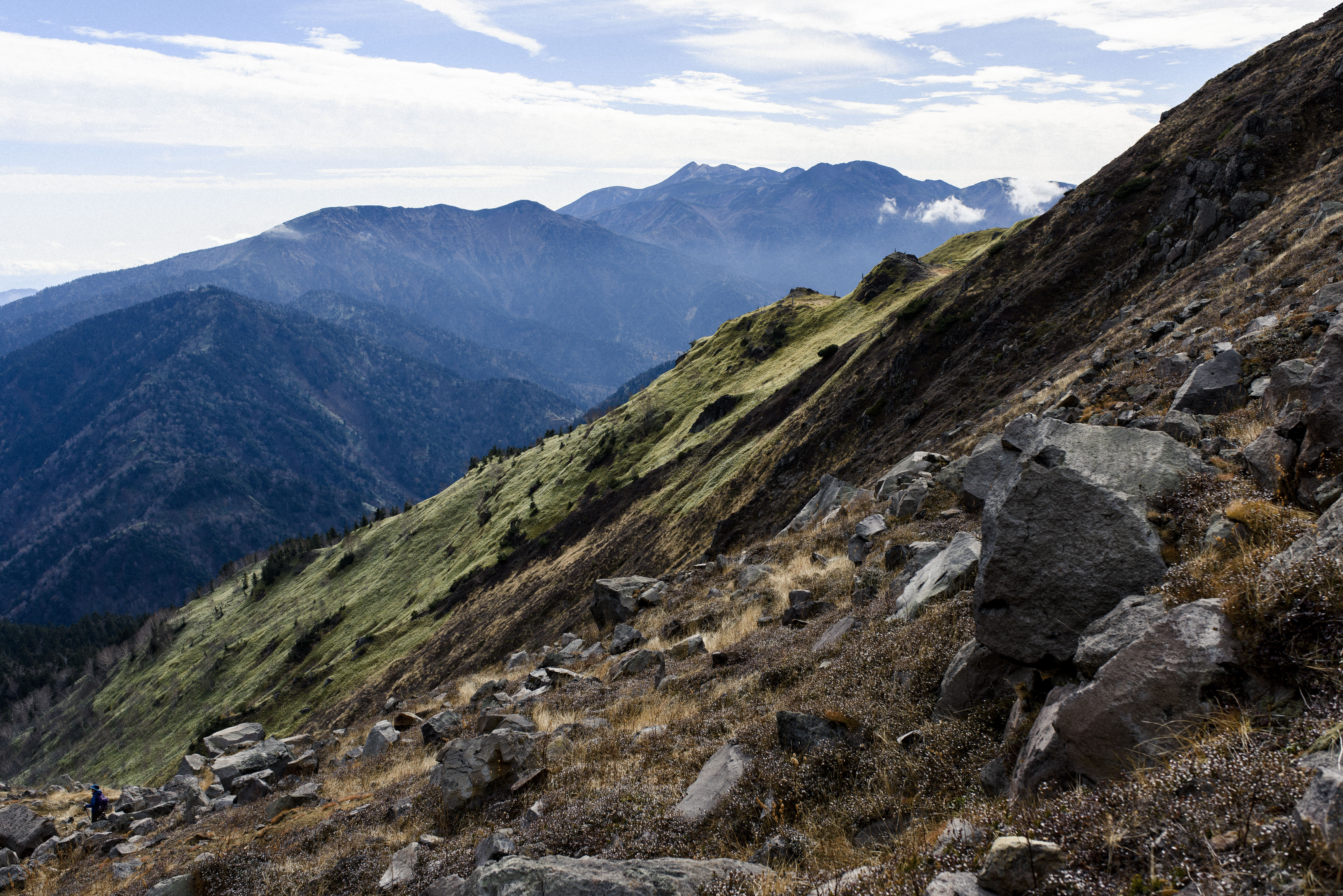 焼岳から乗鞍岳方面を望む山岳風景の写真素材です。重厚な山並みと青空が広がり、登山道沿いの岩場や稜線が連続して見える構図となっています。北アルプス飛騨山脈の雄大な景観は、登山関連のWebサイトや山岳ガイドブック、アウトドア関連のブログなどに最適です。