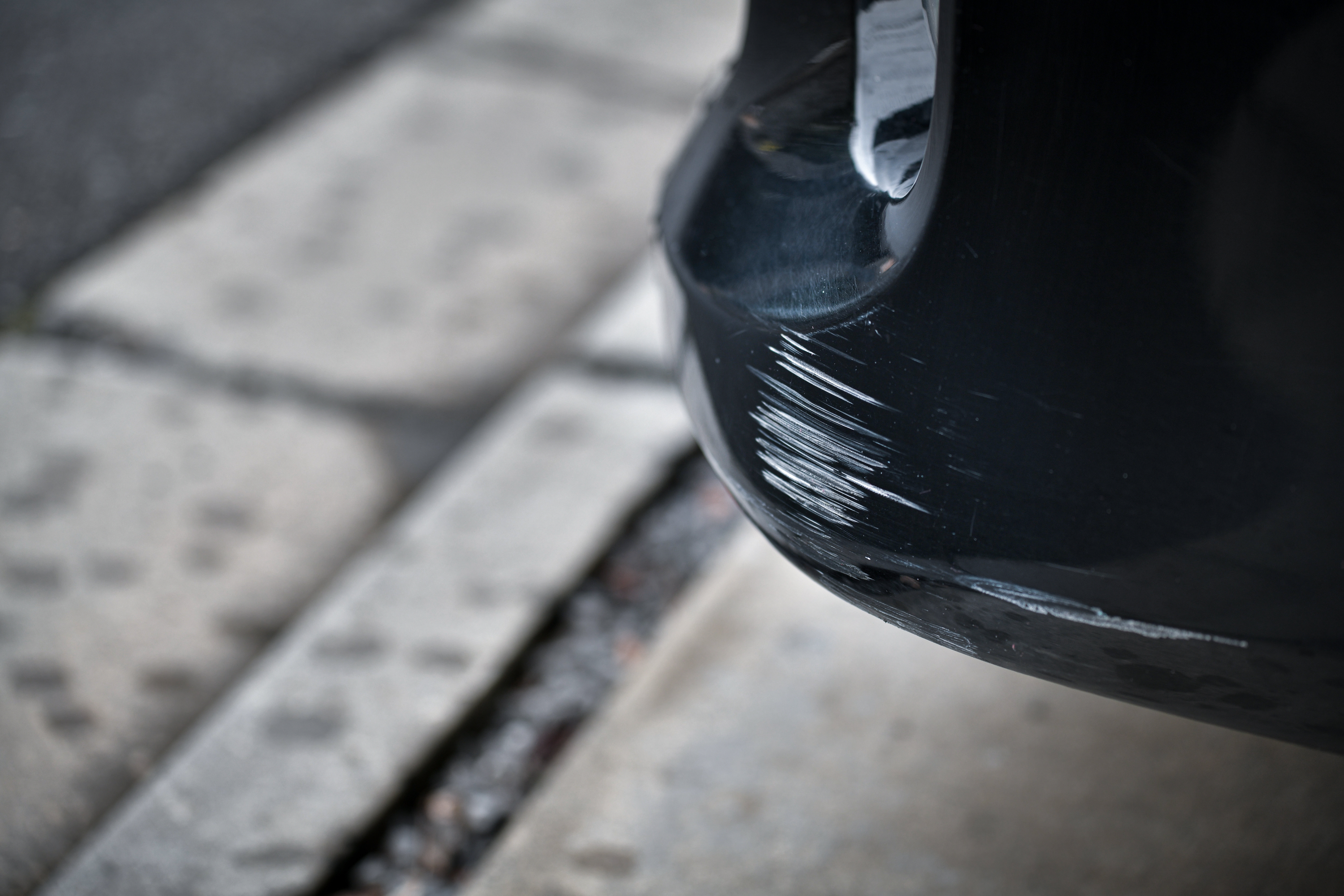車のバンパーに傷がついてしまった状況の写真素材です。黒い車体のバンパー部分に白っぽい擦り傷が確認でき、交通事故や駐車時の接触によるダメージを記録した画像となります。保険請求の資料、自動車トラブル関連の記事作成などにおすすめです。