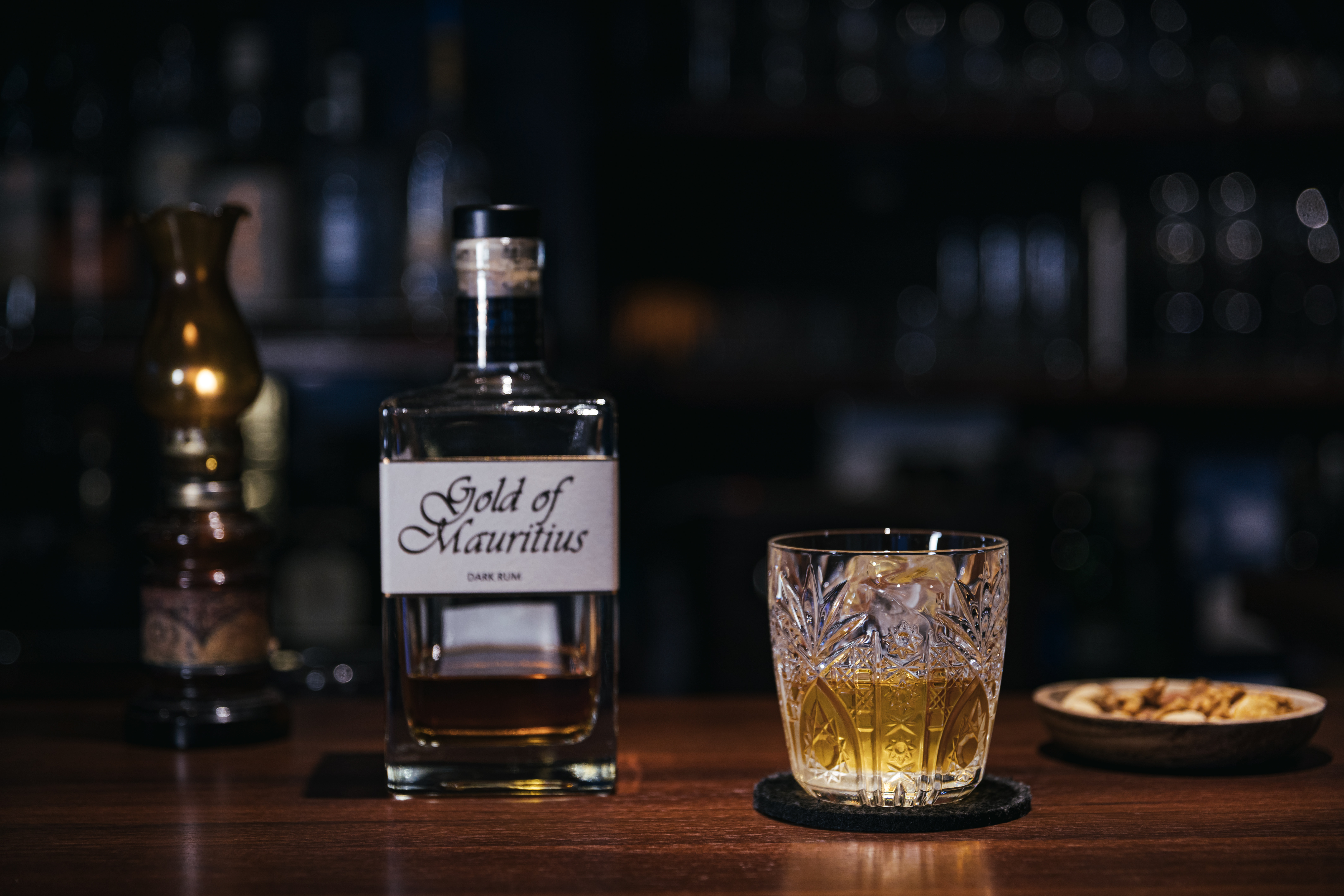 Whiskey Glass and Bottle on the Bar Counter