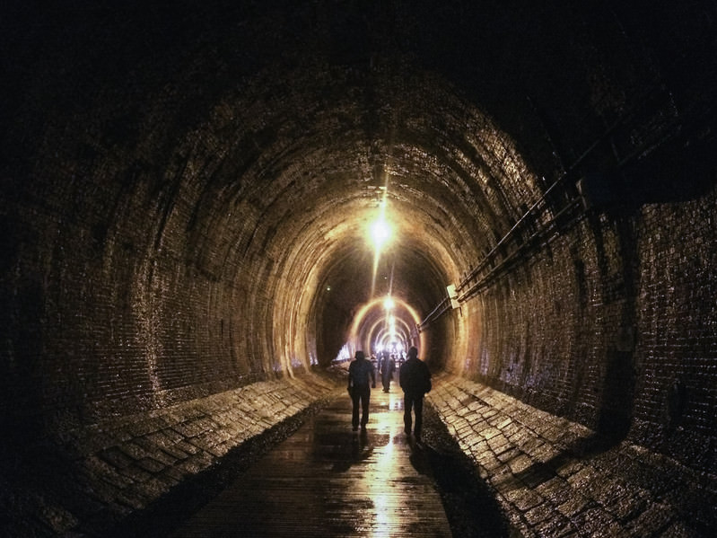 Tourists walking through Minatogawa Tunnel, a heritage site of modernization
