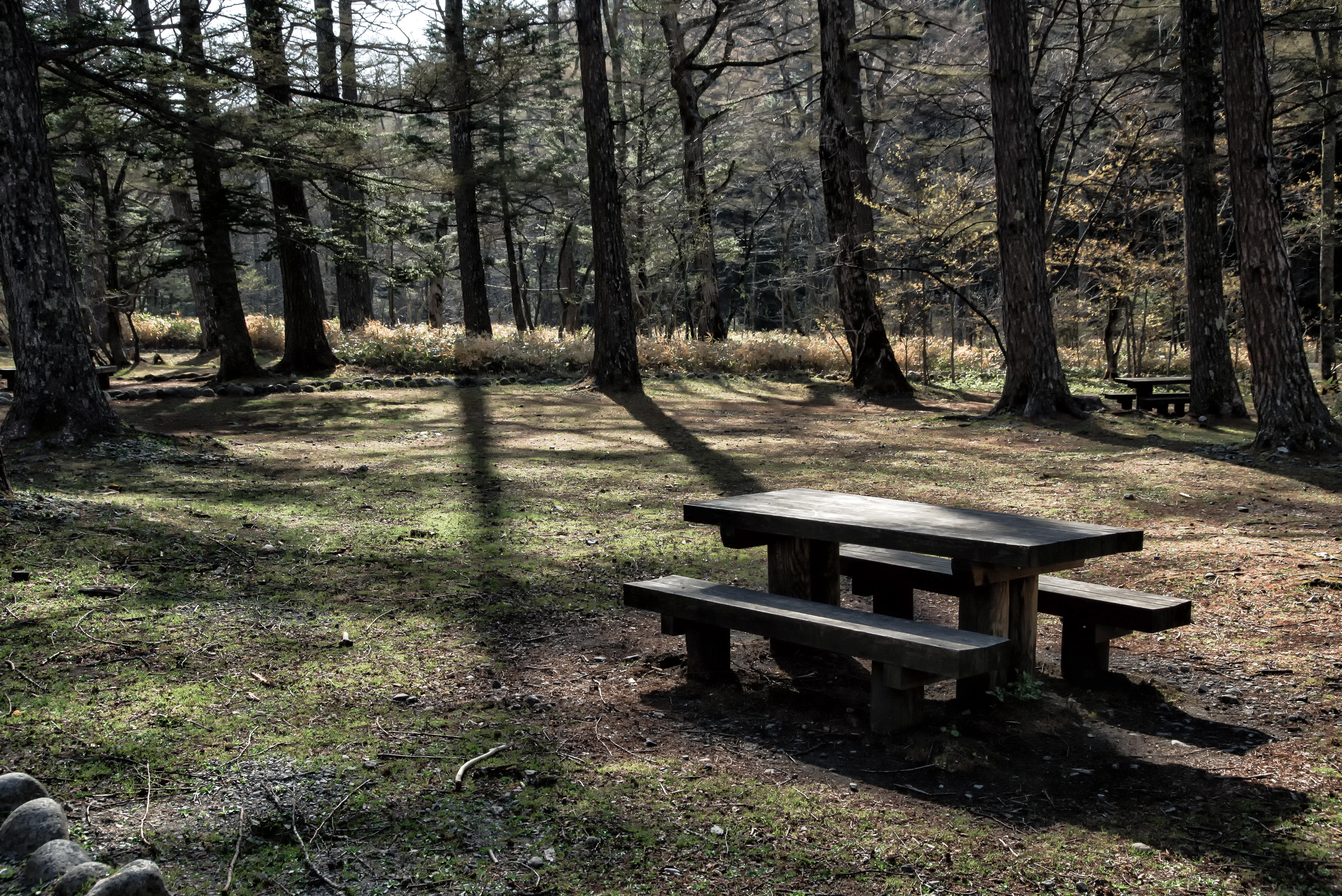 小梨平キャンプ場の広場の写真素材です。木々に囲まれた広場に木製のベンチが設置されており、樹間から木漏れ日が差し込む休憩環境が整えられています。キャンプサイトの案内やアウトドア関連の記事、観光地の紹介などにおすすめです。