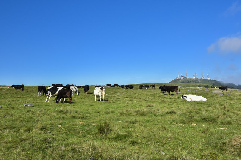 美ヶ原高原に放牧された牛とホテルの写真素材です。日本百名山の一つ美ヶ原では、標高1,900m超の高原で緑の草原に放牧された牛の群れが草を食み、白いホテル建物が高原風景を形作っています。登山やアウトドア、観光地紹介、自然風景を扱うコンテンツなどにおすすめです。