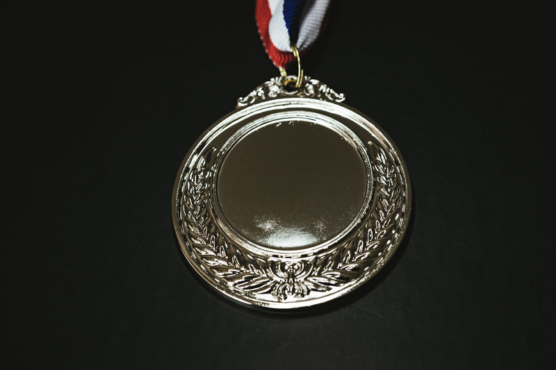 赤白のリボンが付いた銀色のメダルの写真素材です。光沢のある銀色の表面に装飾的な模様が施され、赤と白のストライプのリボンが取り付けられています。スポーツ大会や表彰式の資料、競技関連のデザイン制作などにおすすめです。
