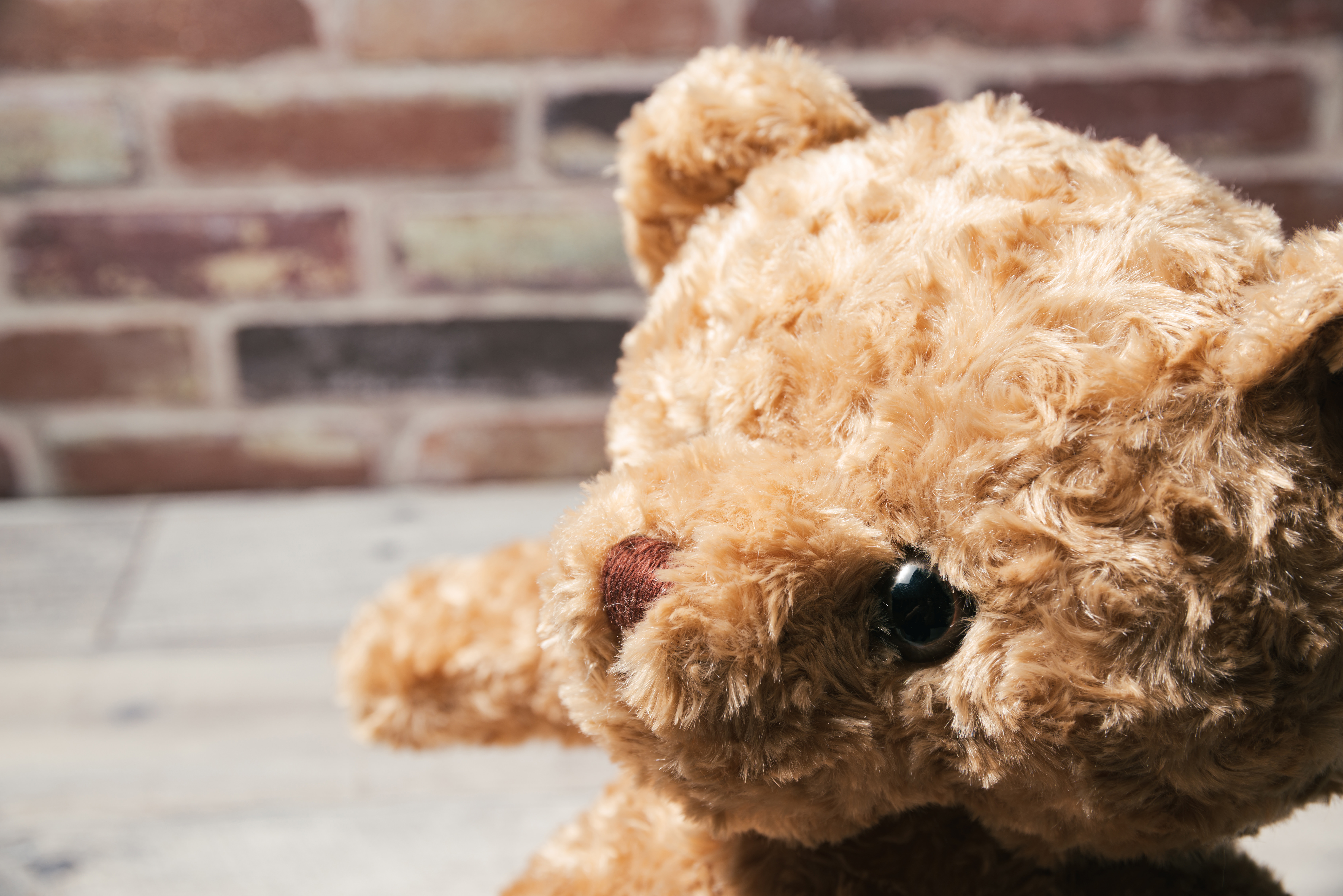 テディベアのぬいぐるみの写真素材です。茶色の毛並みに毛玉が付いたクマのぬいぐるみで、レンガ壁を背景にやや俯き加減の寂しい表情が映っています。感情表現やキャラクター素材、アート作品の参考など多くのコンテンツ制作におすすめです。