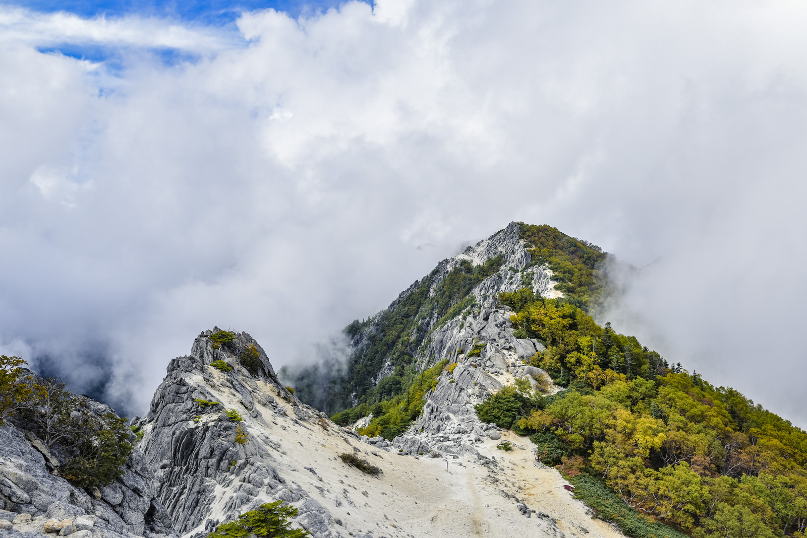 白砂が広がる鳳凰山の稜線の写真素材です。岩と緑の植生が点在する稜線を歩む登山者の風景で、晴れた空には白い雲が浮かんでいます。鳳凰三山は日本百名山の一つとしても知られ、登山ガイドや山岳コンテンツ、アウトドア関連のWebサイトやブログなどにおすすめです。
