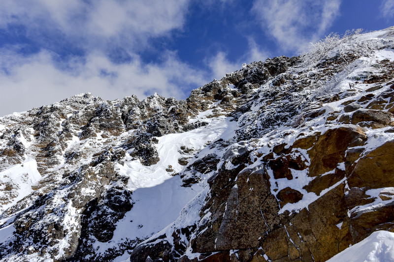 雪化粧した赤岳の岩稜地蔵尾根の写真素材です。八ヶ岳連峰の100名山である赤岳の尾根上に露出した岩場に白い残雪が積もり、険しい岩稜を呈しています。青空と白い雲が広がり、冬山登山やアウトドア関連のWebサイト、山岳ブログなどの素材として最適です。