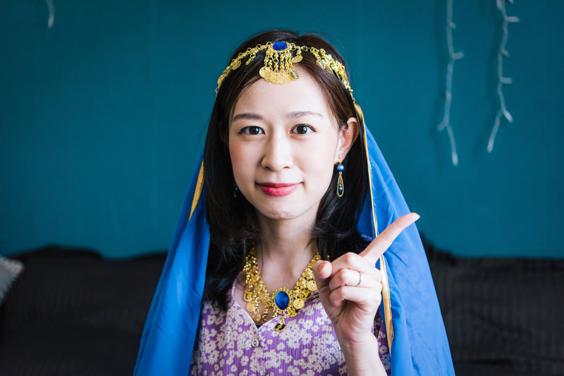指差しポーズをする占い師の女性の写真素材です。青い衣装を身に着けた女性が人差し指を立てて微笑みながら、相手に向けてワンポイントアドバイスを伝えるような表情で指差しをしています。占いサイトやスピリチュアル系のコンテンツ、運勢や相談関連の記事制作などにおすすめです。