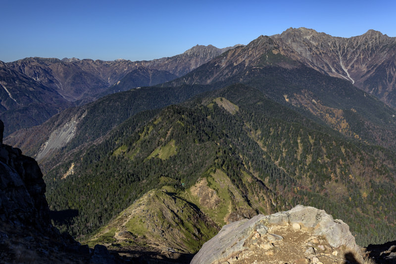 焼岳の山小屋と遠方の槍ヶ岳の写真素材です。手前に緑の山肌に建つ山小屋があり、背景には日本百名山の槍ヶ岳を含む北アルプスの飛騨山脈の山々が雄大に連なって見えています。登山ガイドやアウトドア関連サイト、山岳写真を必要とするコンテンツ制作におすすめです。