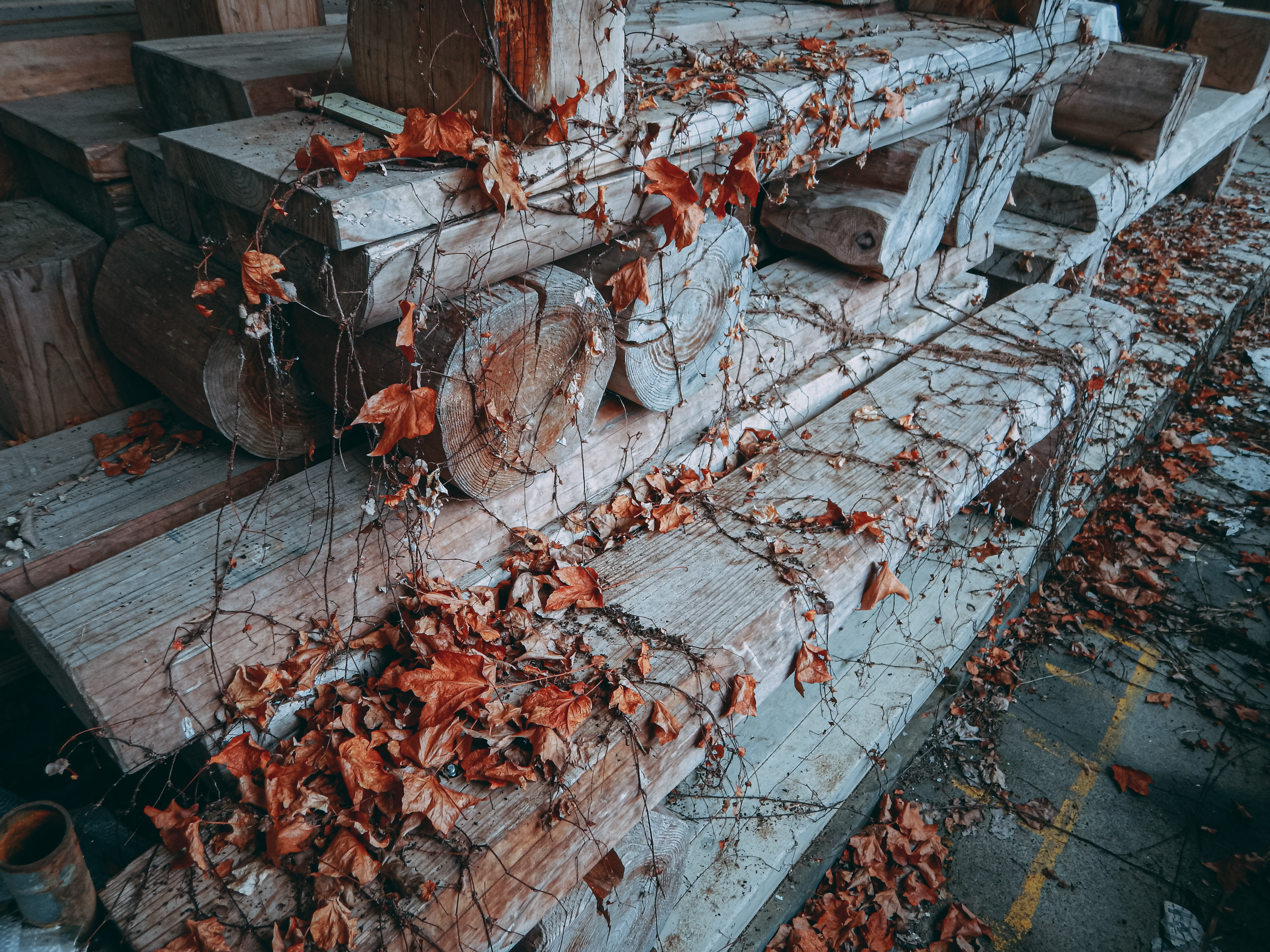 木製のベンチに絡まる枯れた蔦の写真素材です。古い木製ベンチの表面に茶色く枯れた蔦が這い、時間とともに朽ちた木の質感と絡みつく蔦が重なり、廃墟特有の侘びた空間を表現しています。ホラー系や廃墟をテーマにしたコンテンツ制作に最適です。