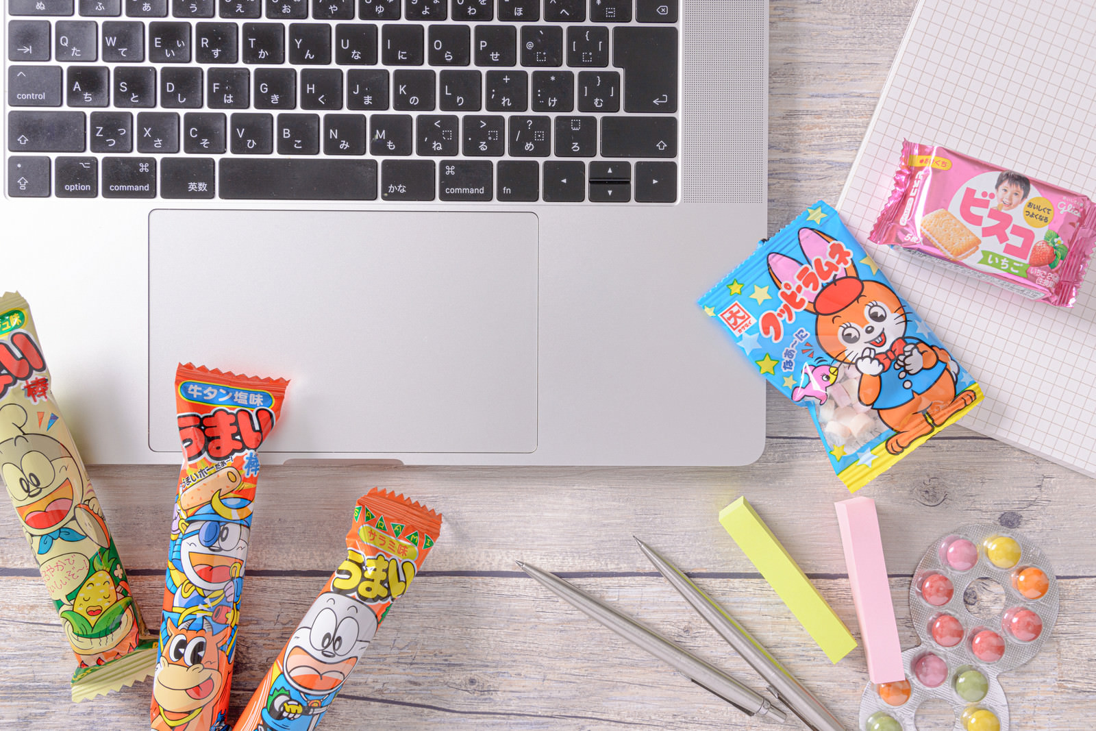 仕事中に小腹が空いたら食べるおやつの写真素材です。ノートパソコンのキーボード、ペン、付箋といったデスクワーク用品の横に、うまい棒、ビスコ、ラムネなどのお菓子が並べられています。オフィスやリモートワークの休憩時間、デスクワーク関連のコンテンツ制作におすすめです。