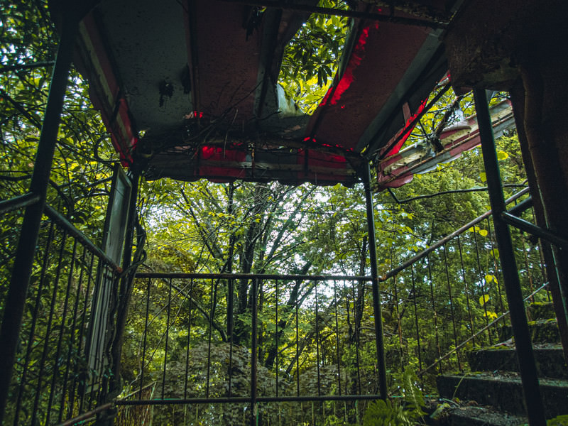 天井が破れた不気味な階段の写真素材です。薄暗い建物内で天井が大きく破損し、緑の植物が繁茂する中、石造りの階段が段々と降りています。ホラー系のコンテンツやミステリー小説の表紙、廃墟をテーマにした作品などにおすすめです。