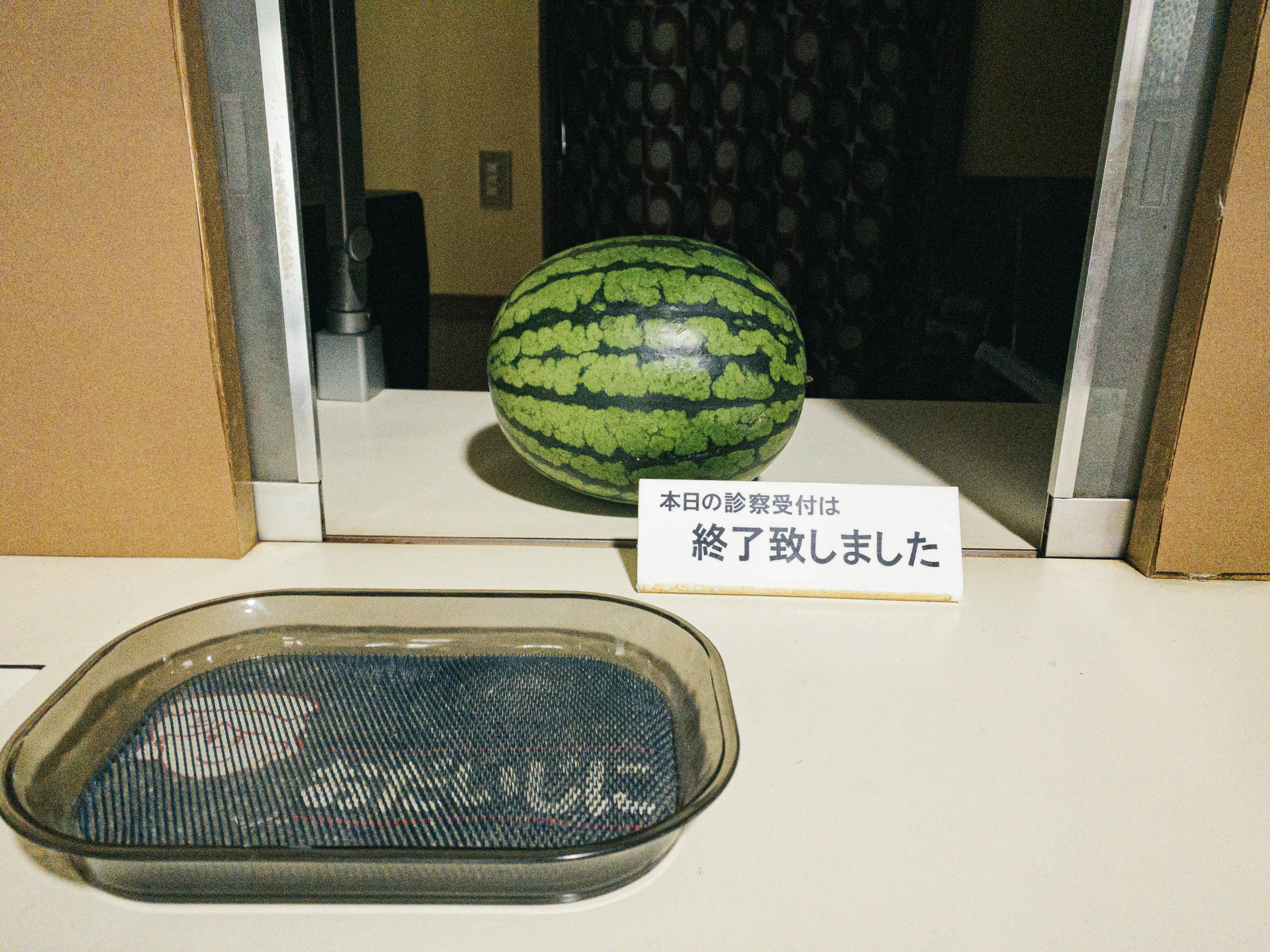 受付窓口に置かれたスイカと診察受付終了の札の写真素材です。緑色の縞模様のスイカが受付カウンターに座り、横には「本日の診察受付は終了しました」と「おだいじに」と書かれた札が立てられています。病院やクリニックの受付案内、ユニークな掲示表現、ユーモアある演出素材などにおすすめです。
