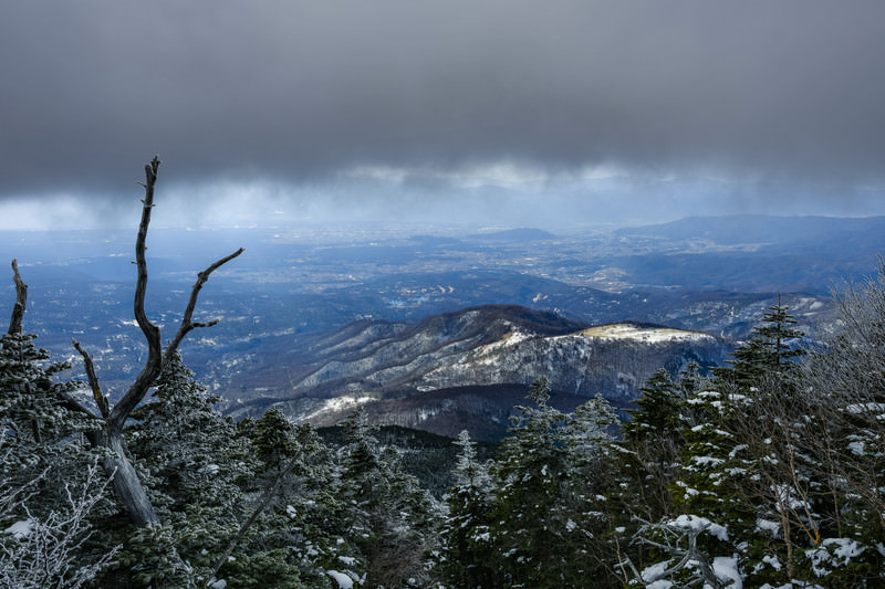 雪雲の下に広がる蓼科山麓の冬景色の写真素材です。重い曇天に覆われた空の下、蓼科山を含む雪化粧した山々と麓の街並みが静寂に包まれ、手前には枯れ木が立っています。登山やハイキング、冬の観光プロモーション、日本百名山の紹介コンテンツなどにおすすめです。