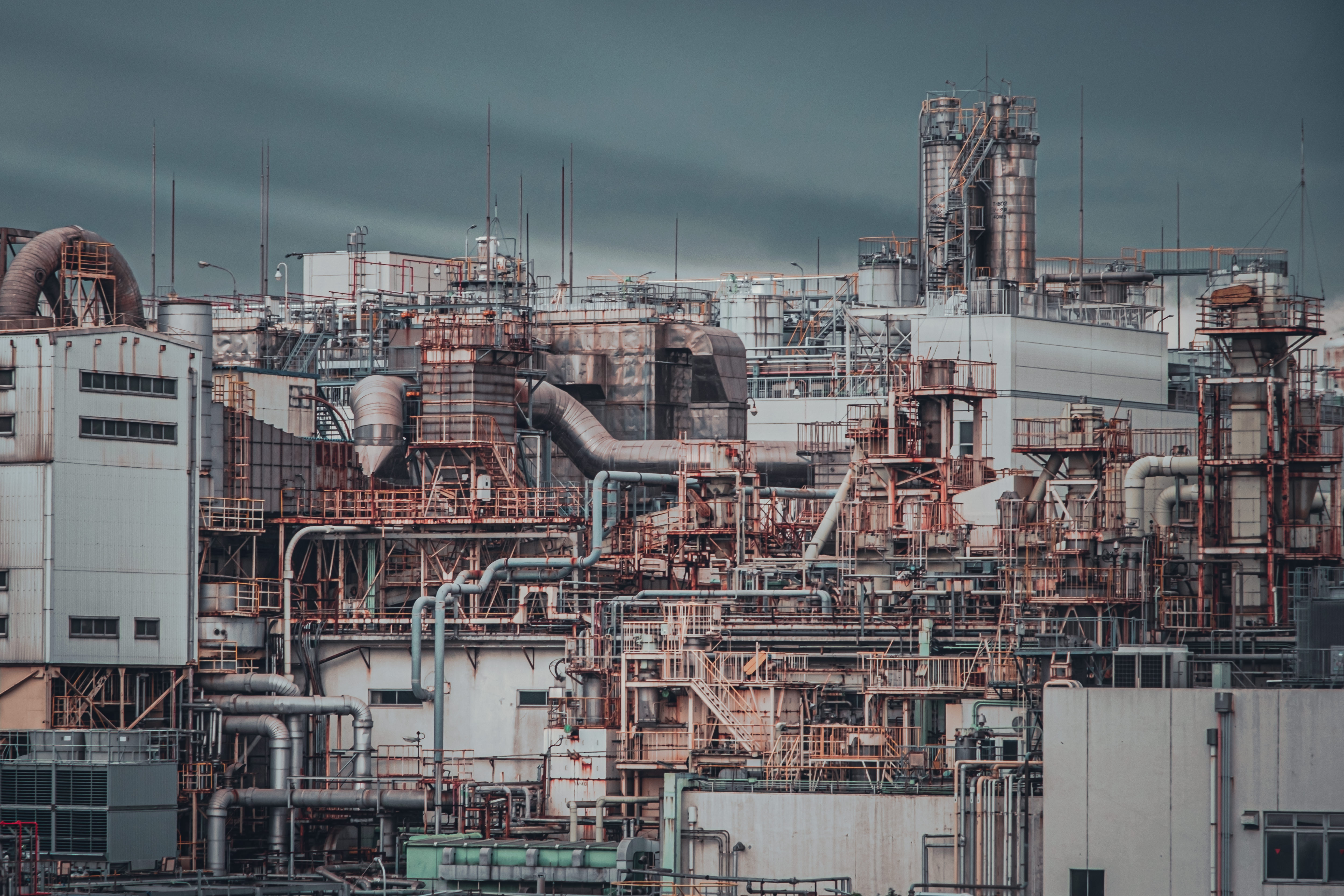 工場のプラント設備の写真素材です。複雑に張り巡らされた配管や大型設備が立ち並び、曇り空を背景に工業構造物が壮大に聳え立つ光景が映し出されています。産業施設の規模感と技術的複雑性が強く表現された1枚で、工業・産業関連の記事制作やカタログ作成などにおすすめです。