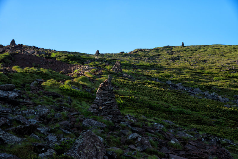 硫黄岳山頂付近に林立するケルン(八ヶ岳)の写真素材です。緑の苔に覆われた岩場に複数のケルンが設置され、石を積み上げた構造が登山者の道しるべ・道標として機能しています。登山記事やトレッキングガイド、山岳関連のコンテンツ制作などにおすすめです。