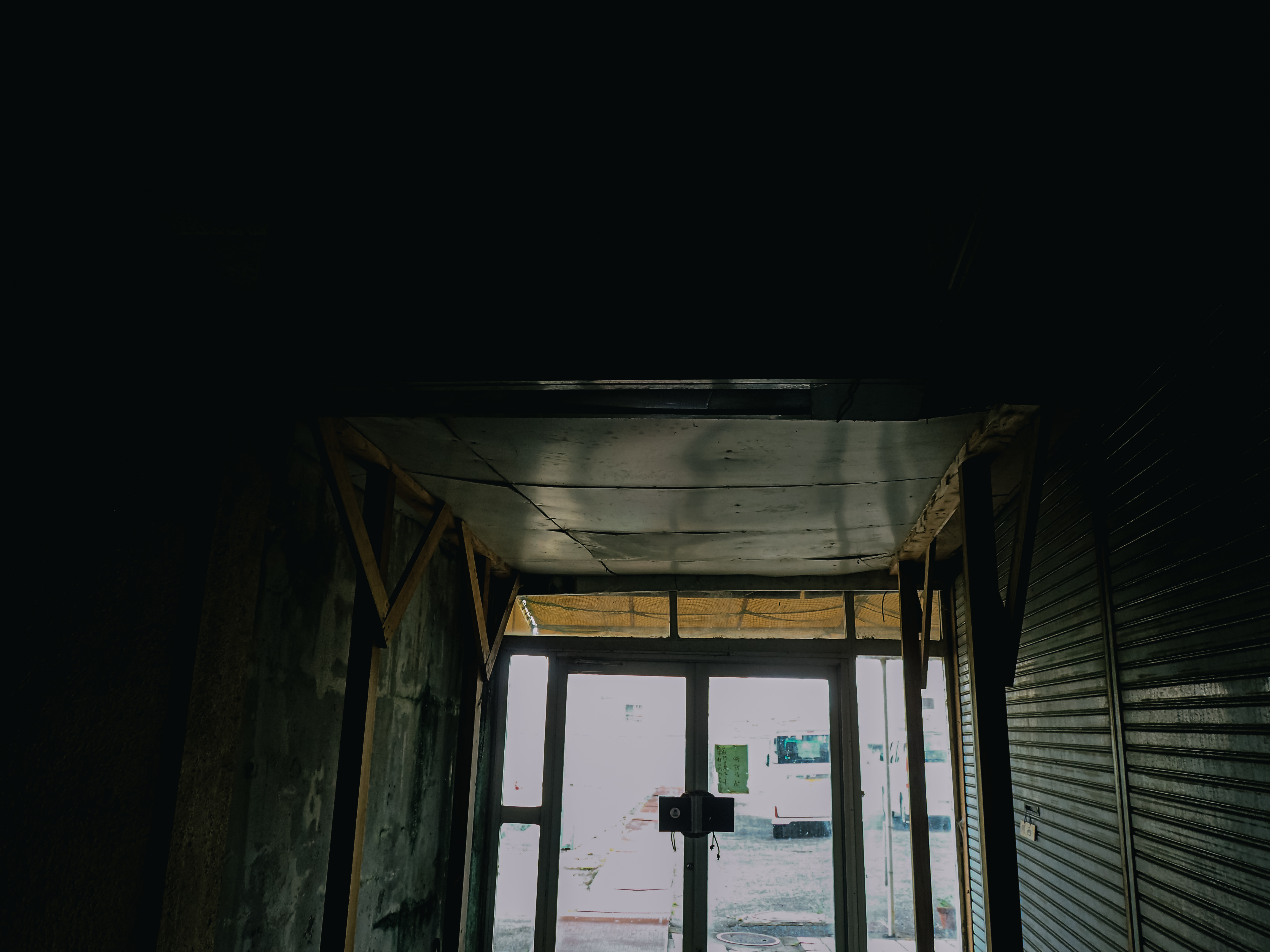 薄暗いアーケード内から外の光が見える廃墟のような市場の出口の写真素材です。古びたシャッターや錆びた金属部分が見える通路の先に、外からの光が差し込んでおり、昭和の商店街の衰退した風景が写っています。廃墟の雰囲気を必要とするデザインや背景素材として活用できます。