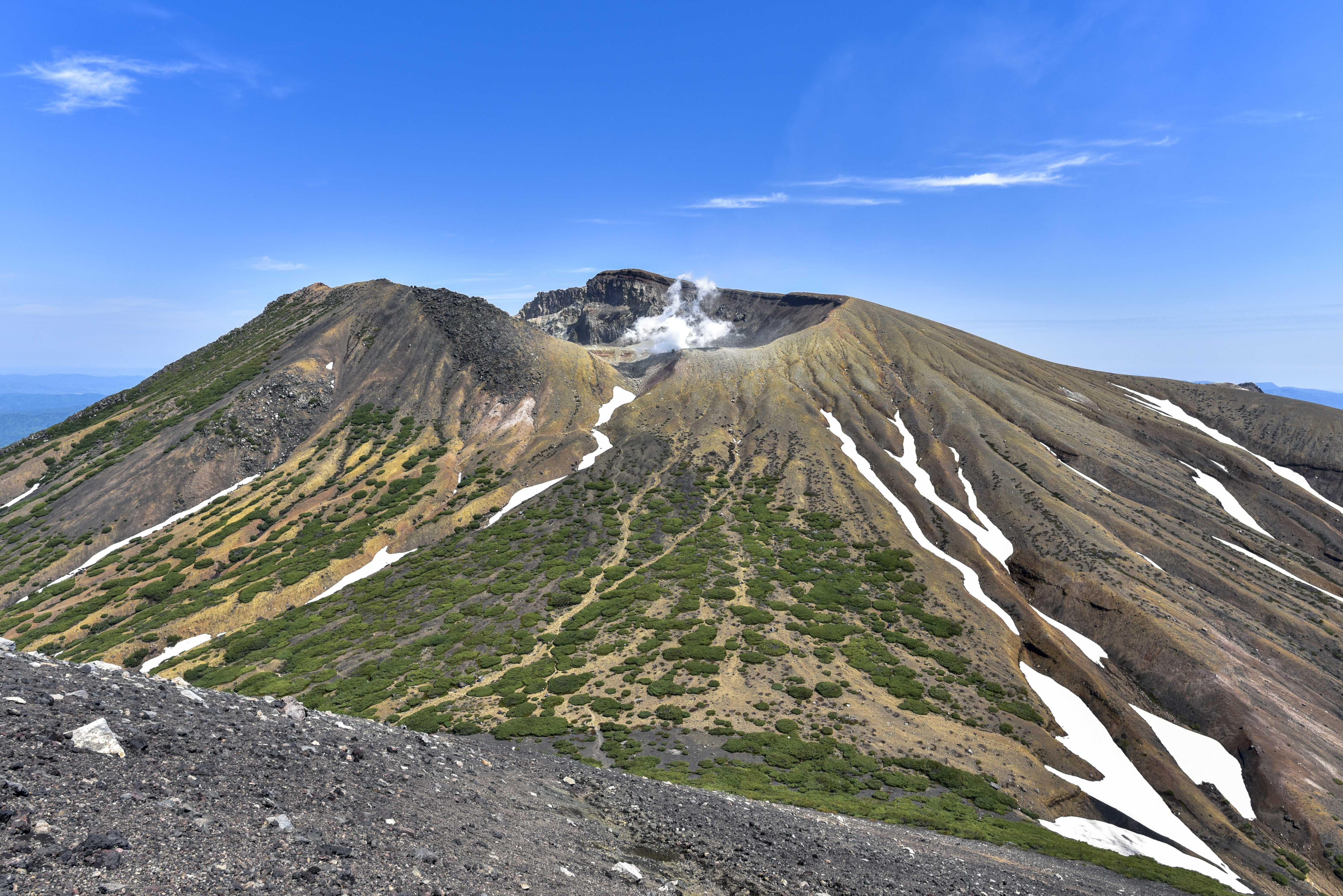 日本百名山の雌阿寒岳を阿寒富士山頂から撮影した写真素材です。青空の下に雌阿寒岳がそびえ、斜面には白い残雪が広がり、火山特有の荒々しい地形が確認できます、北海道を代表する火山地帯の雄大な景観をとらえた1枚です。登山記録やアウトドア関連のWebサイト、百名山紹介ブログなどにおすすめです。