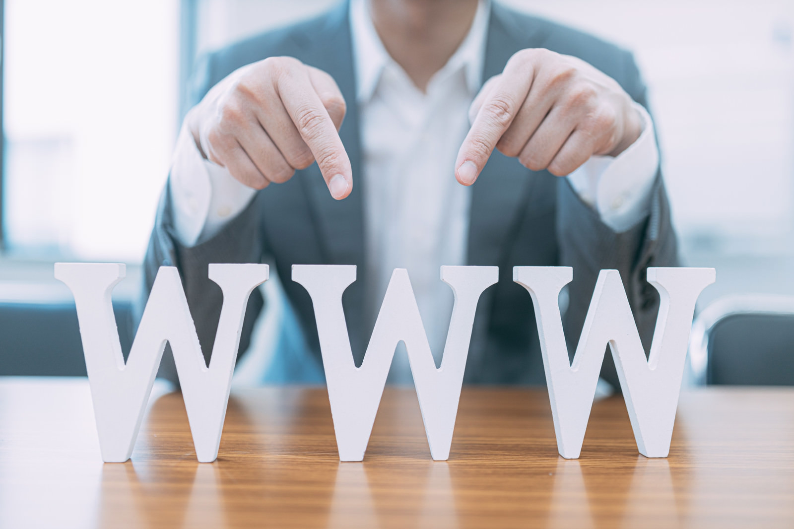 WWWの立体文字を両手で指さすビジネスマンの写真素材です。スーツ姿の男性が木目テーブルの上に並ぶ白い「W」を上から指している。インターネットやウェブサイト、サイト売買に関する資料・コンテンツにおすすめです。