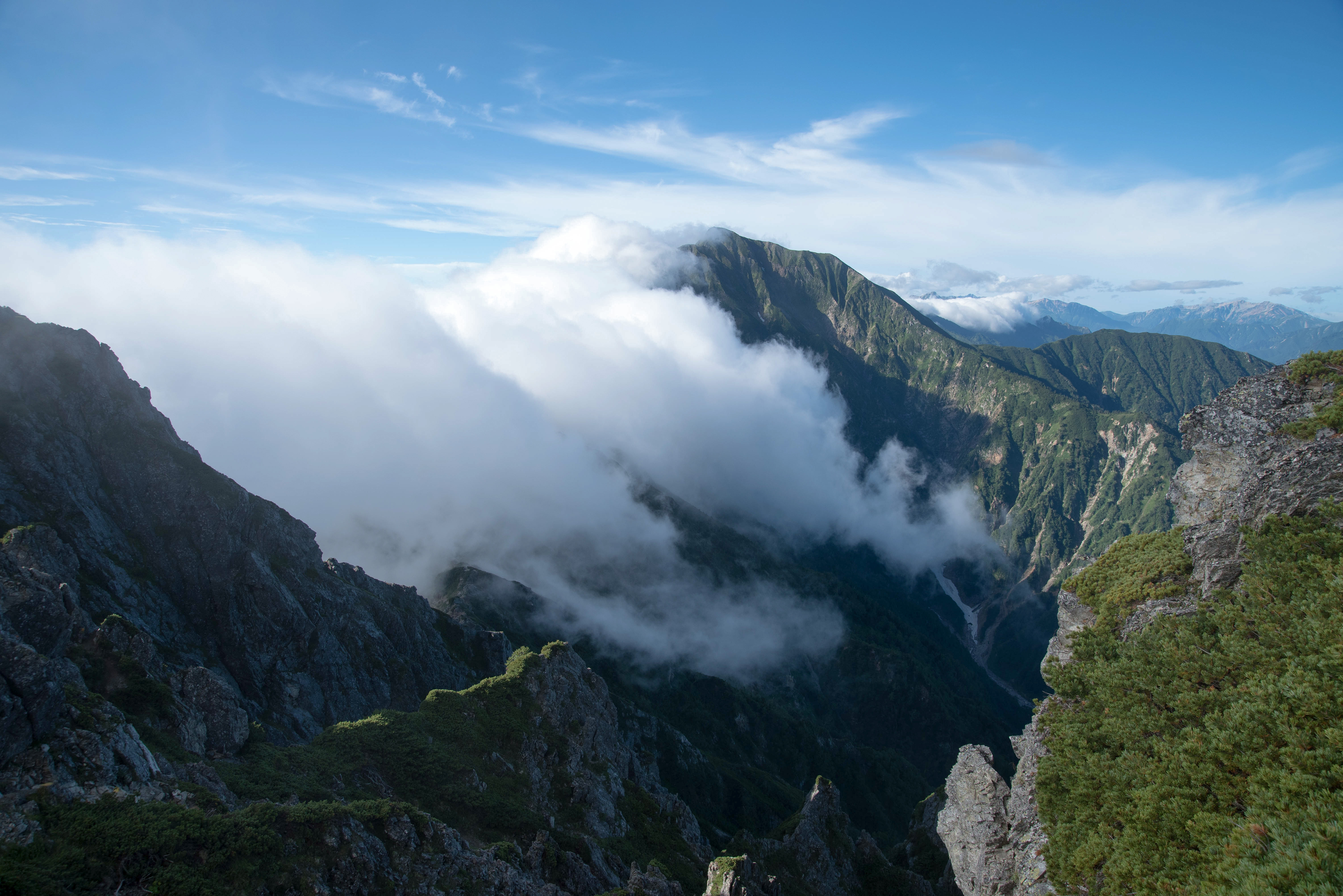 長く伸びる稜線に覆いかぶさる雲の写真素材です。八峰キレットの険しい山々の稜線に白い雲がかかり、青空と雲海の境界が明確で、三大キレットの一つとして知られるこの連峰の壮大な山岳風景が広がっています。登山やキレット縦走の紹介、山岳写真集などにおすすめです。