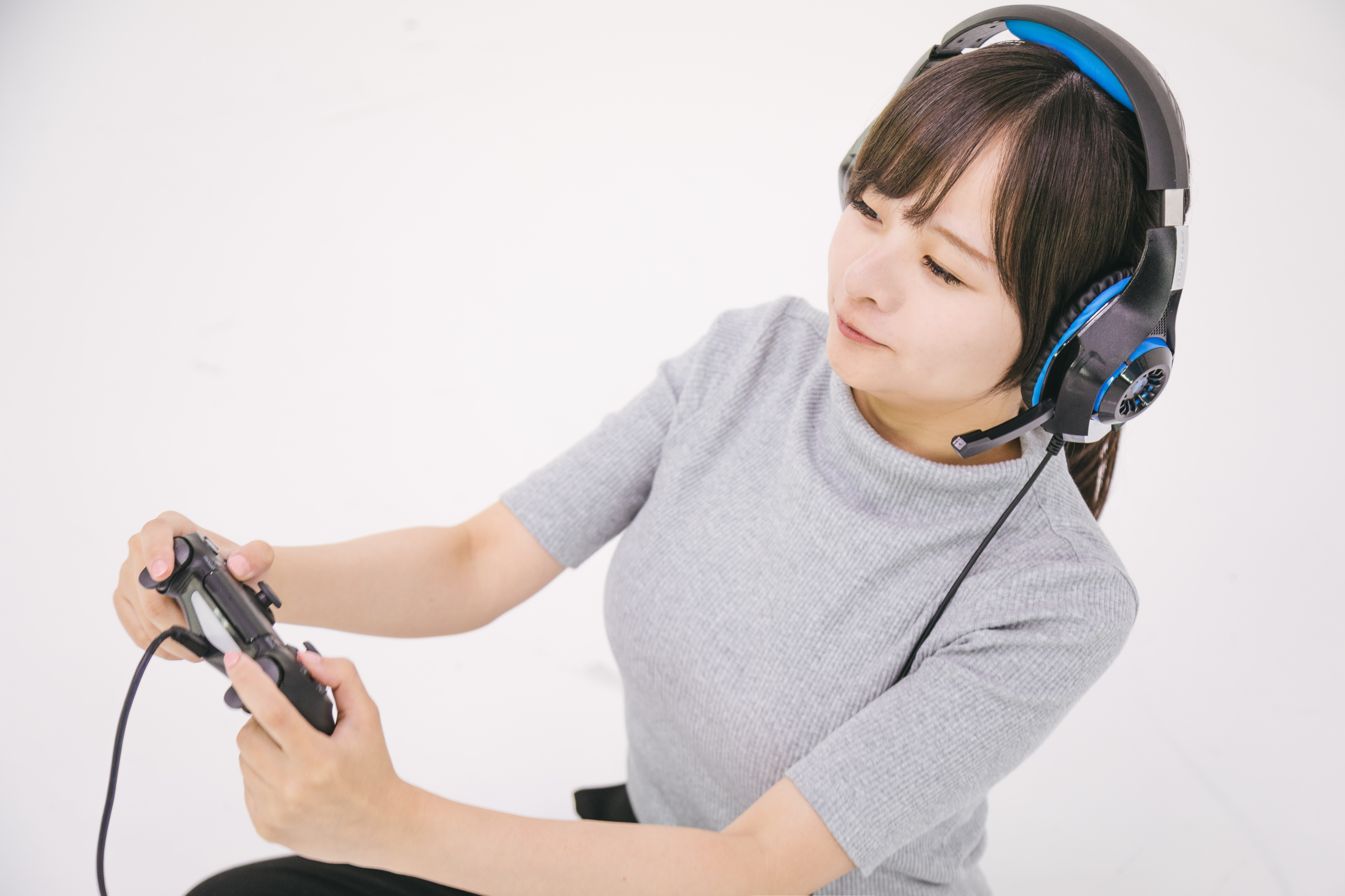 PS4のゲームコントローラーを握る女性の写真素材です。グレーのトップスを着用し、ヘッドホンを装着してゲーム画面に集中しており、両手でコントローラーを操作しています。ゲーム実況やゲーム関連のコンテンツ制作、エンターテイメント業界の素材などにおすすめです。
