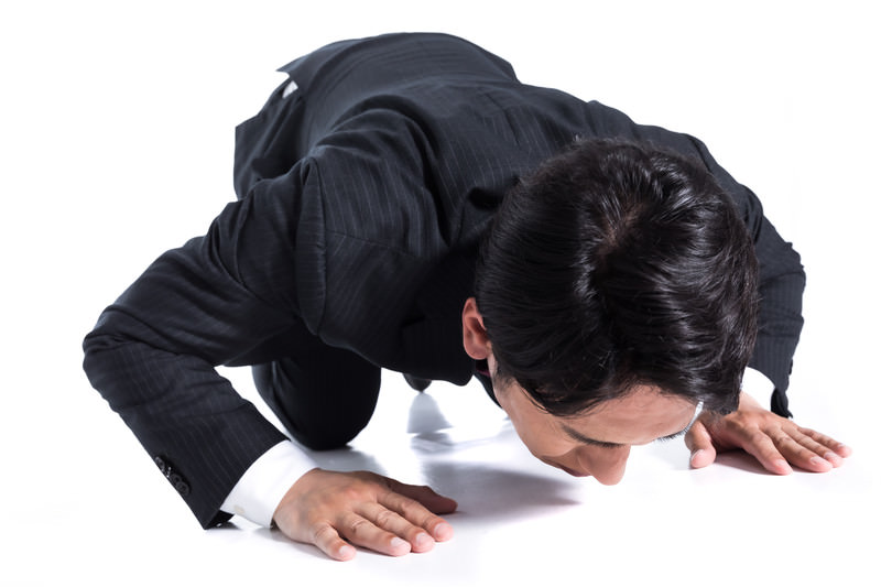 土下座で謝罪するスーツ姿の男性の写真素材です。黒いスーツを着た男性が床に手をついて深々と頭を下げ、申し訳ございませんでしたと謝罪する場面を撮影しています。謝罪や反省をテーマとしたWebサイト、ブログ記事、ビジネス関連のデザイン素材などにおすすめです。