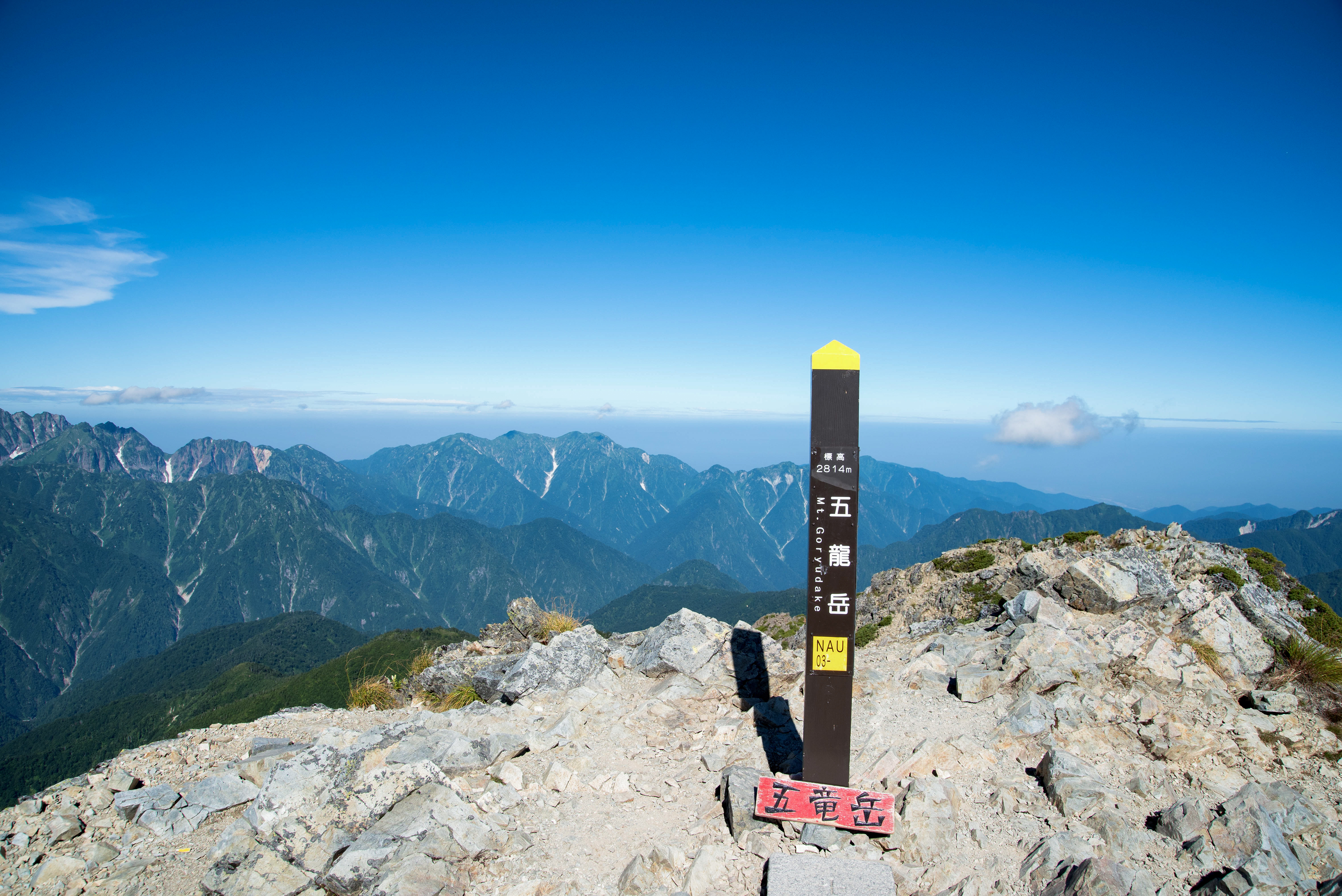 北アルプスの五龍岳山頂標の写真素材です。岩稜に立つ山頂標の奥には、八峰キレット経由で連なる北アルプスの山々が青空の下に望めます。キレット縦走ルート上から撮影した、登山記録に最適な一枚です。