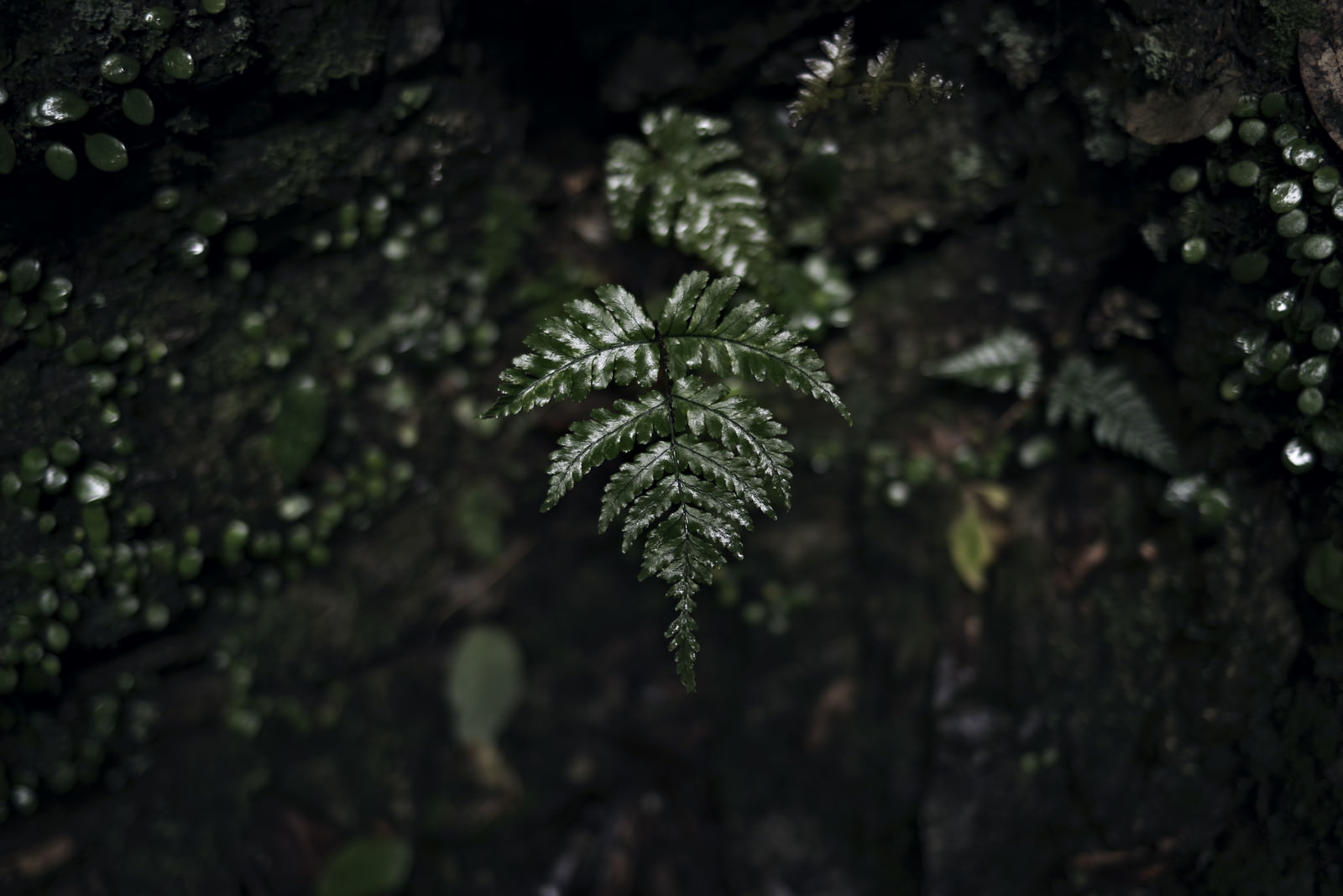 暗闇に浮かび上がるシダの葉の写真素材です。深い緑色のシダの葉が暗い背景の中で繊細な形状を際立たせ、光が当たることで金属質な光沢を放っています、林床に生息するシダ植物の生き生きとした表情を記録した作品です。自然や植物をテーマとしたデザイン制作などにおすすめです。