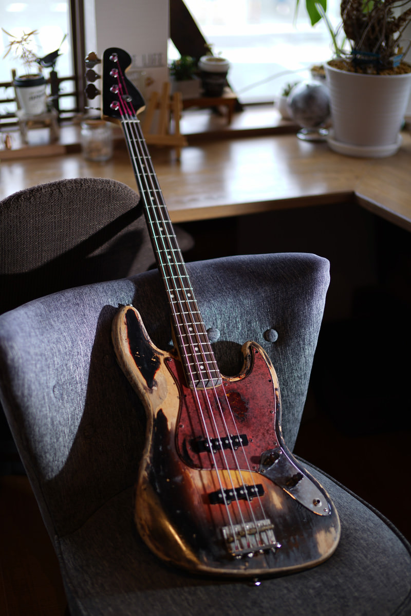 カフェに置かれたエレキベースの写真素材です。木目調のテーブルの上に赤いピックガードのエレキベースが置かれており、カフェの落ち着いた空間を背景に配置されています。ベーシストの愛用する楽器の風情が感じられ、音楽関連のWebサイトやブログ、カフェライブの告知などにおすすめです。