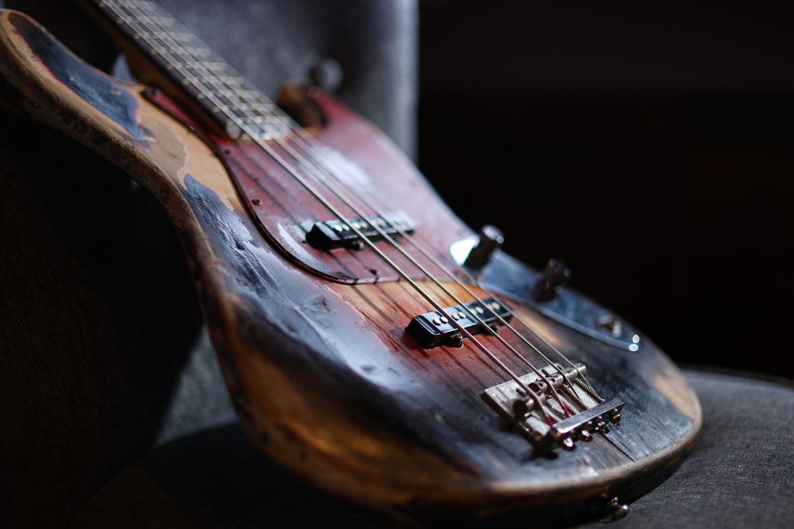年季の入ったデザインのエレキベースの写真素材です。木目調のボディに金属製の弦とフレットが配置され、使い込まれた質感が表れており、ベーシストに長く愛用される楽器の表情を示しています。音楽関連のWebサイトやバンド活動のブログ、楽器店の宣伝素材などにおすすめです。