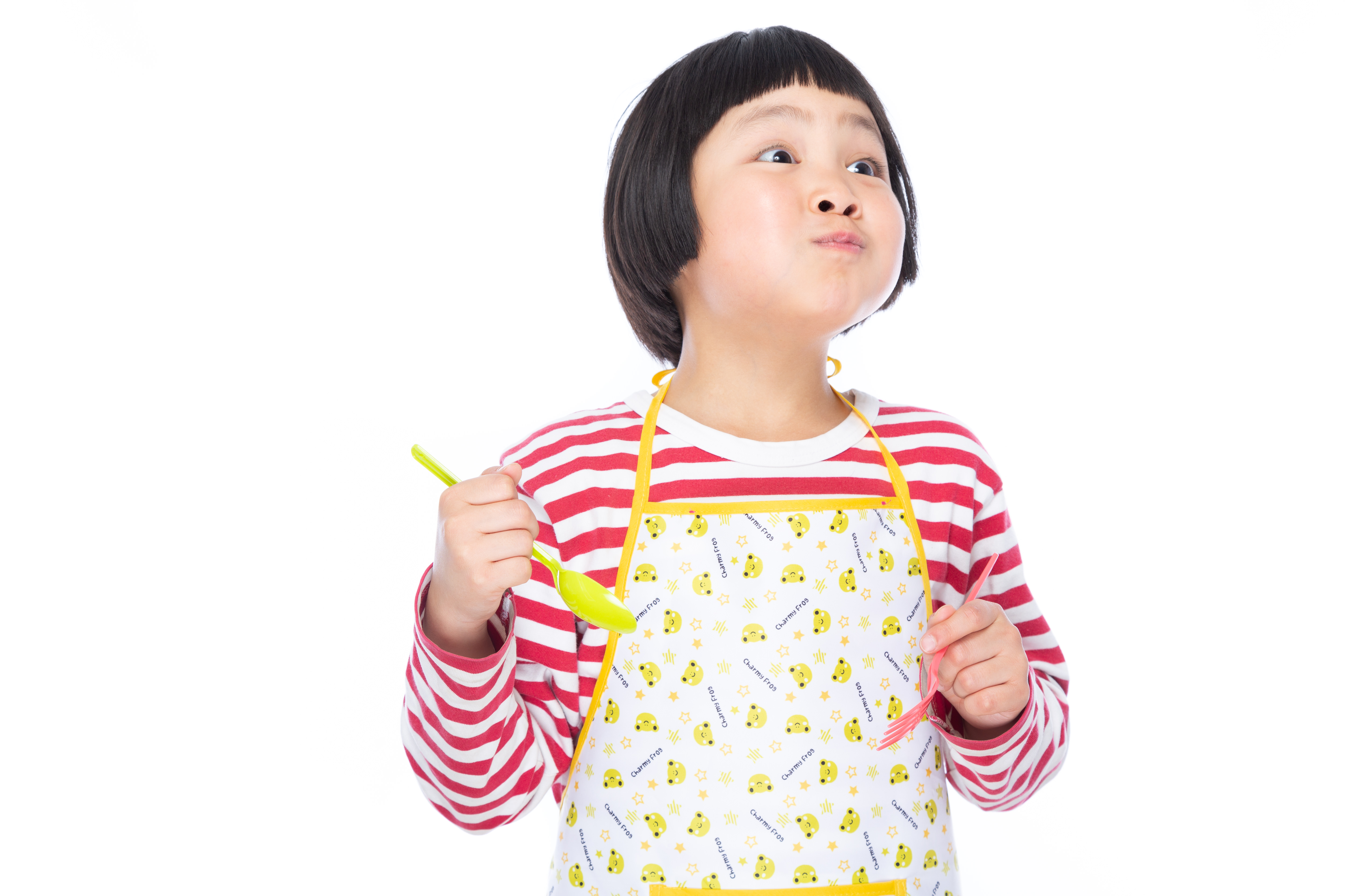 エプロンを着けた女の子が美味しそうに食べ物を口にしている写真素材です。ボーダー柄の服を着た子供が両手を上げて嬉しそうな表情を見せており、食べ物を前にして喜びを全身で表現しています。SNSのネタ投稿や面白いコンテンツ、ユニークなブログ記事、キッズ関連の素材などにおすすめです。