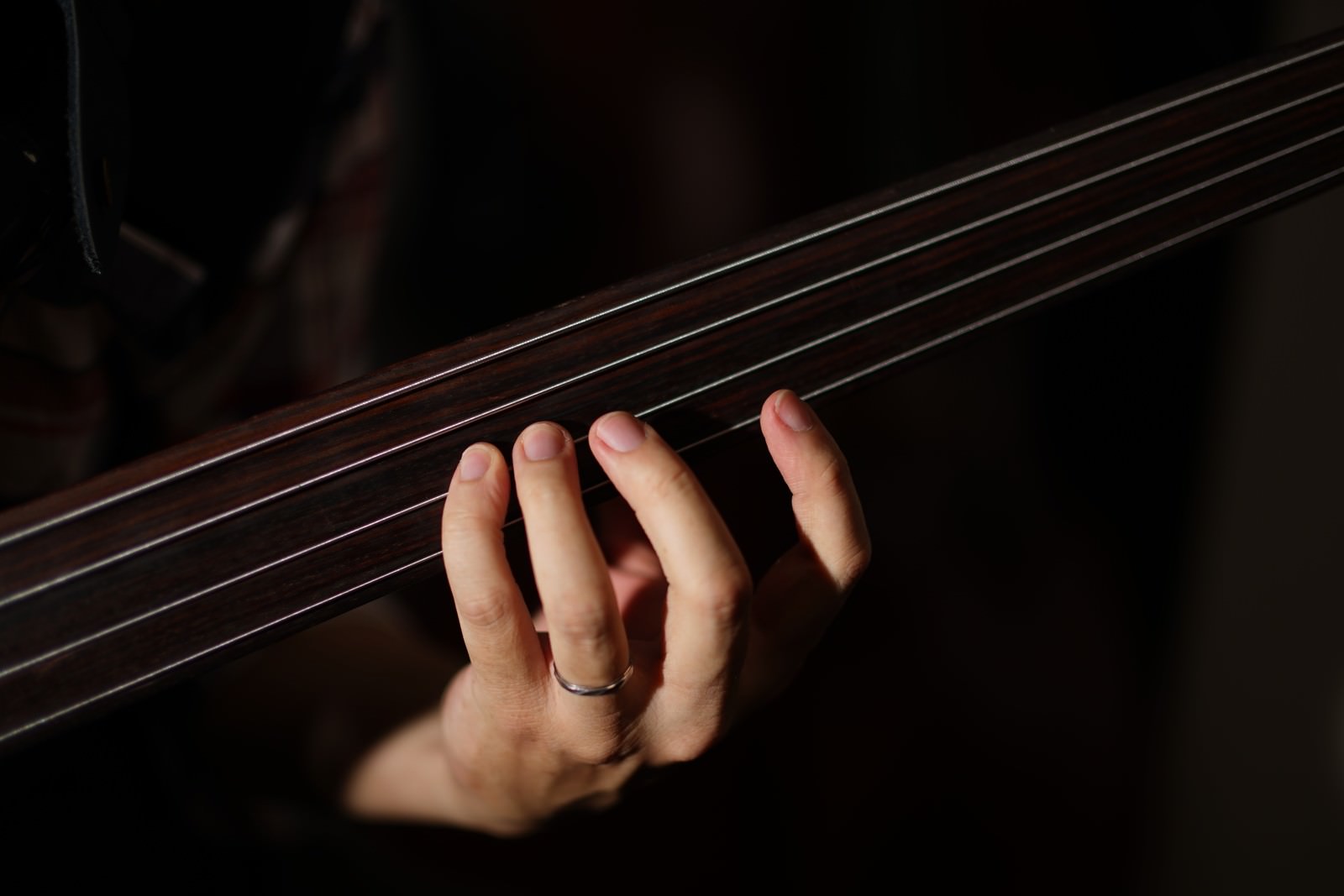 フレットレスベースを押さえるベーシストの左手の写真素材です。暗い背景の中で弦を押さえる指の形や手の位置が明確に見え、弦に接する指の角度や手首の位置などの細部を確認できます。音楽教育やベース奏法の解説、楽器店のWebサイトなどに最適です。