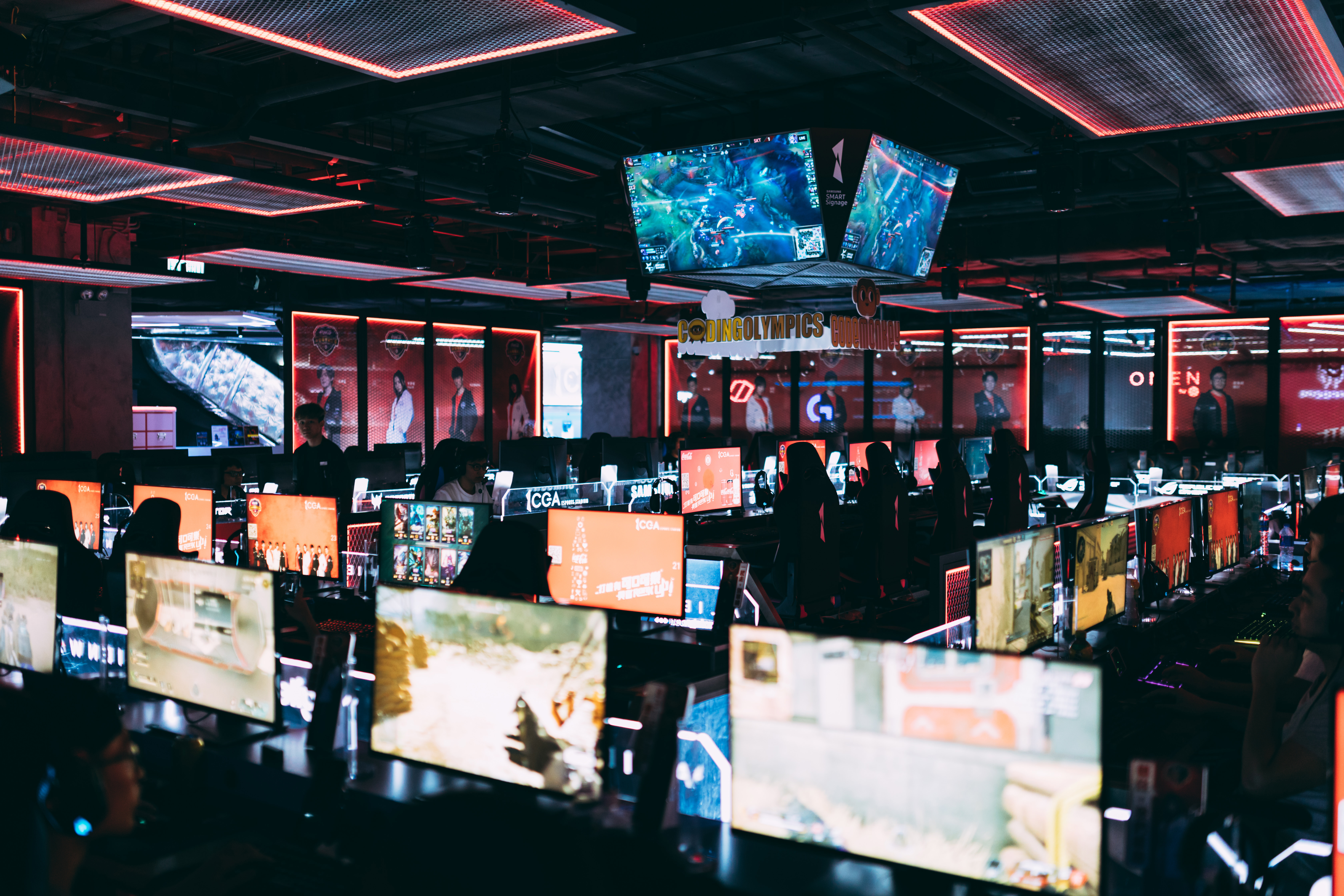 eスポーツ施設でゲームをプレイする複数のプレイヤーの写真素材です。複数のゲーミングモニターが設置され、プレイヤーたちがキーボードを操作している様子が写っています。eスポーツイベントの紹介やゲーミング関連のWebサイト、ブログ記事などにおすすめです。