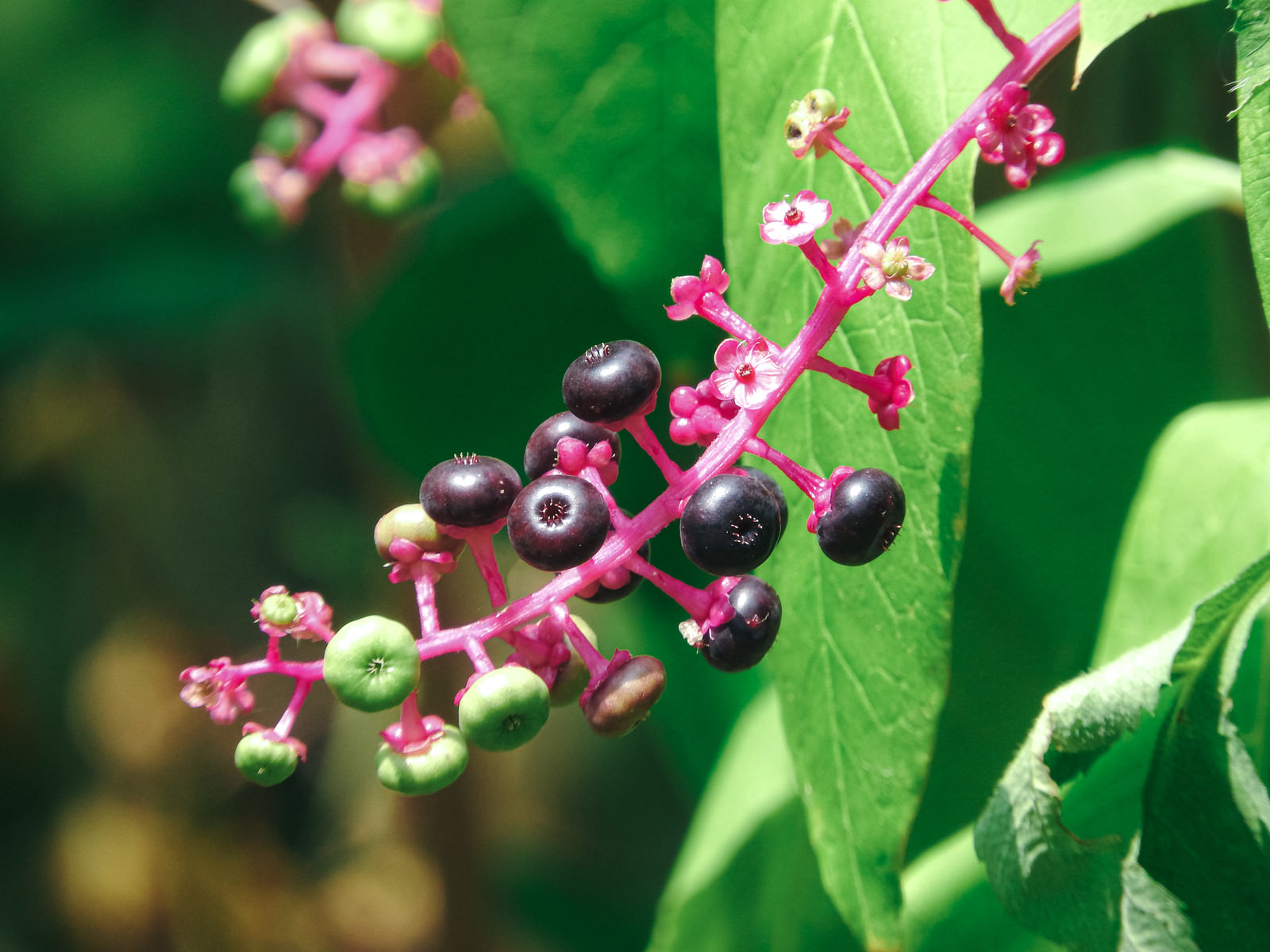 ヨウシュヤマゴボウの枝を接写した写真素材です。黒く熟した実と小さな花が同じ枝に混在している。植物図鑑や自然観察の記事に使いやすい素材です。