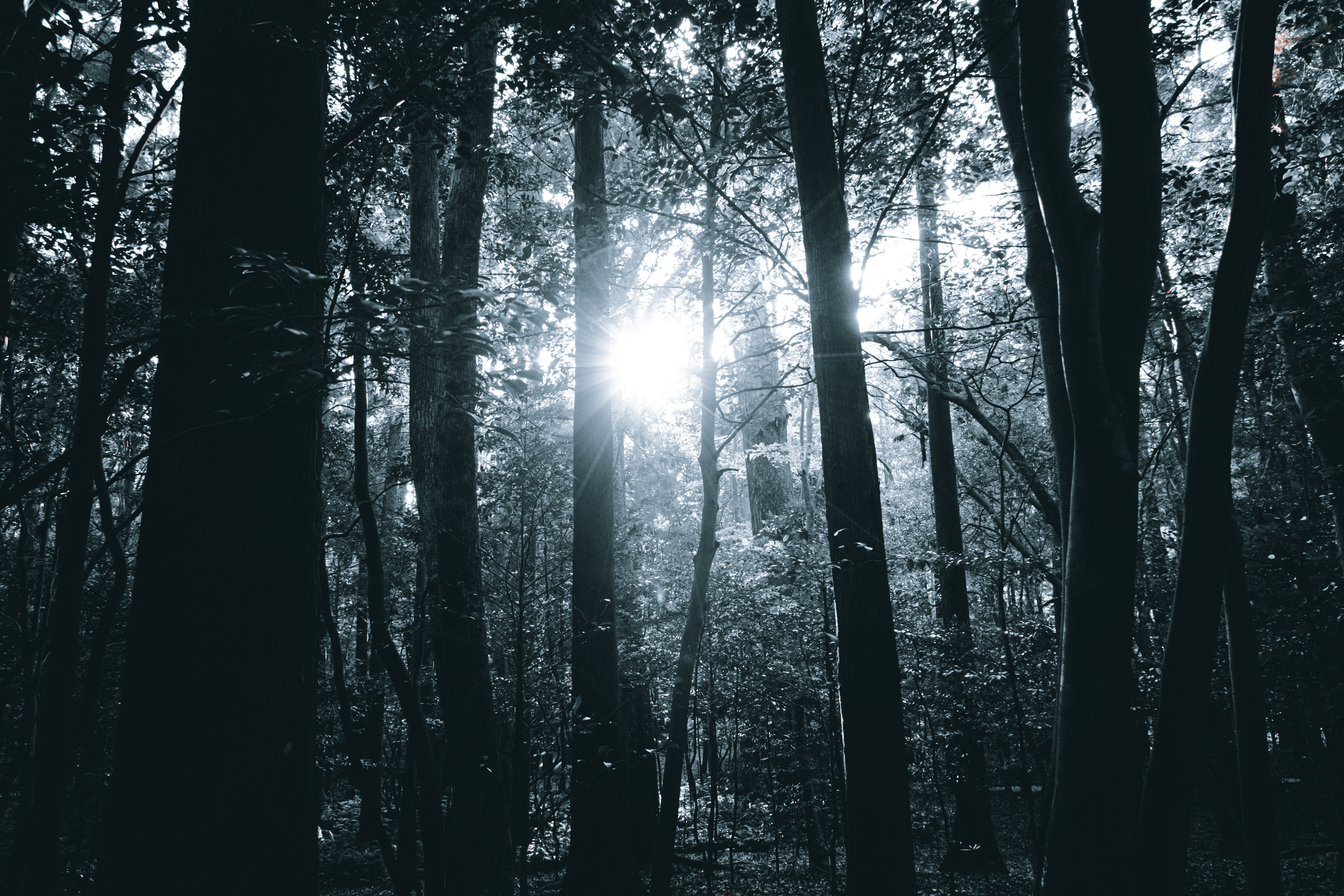 森の中に射し込む光芒の写真素材です。雑木林の木々の間から強い日光が射し込み、木漏れ日となって地面を照らしており、逆光で光が強調されています。午前や昼間の自然風景やWebサイトのヘッダー画像、自然関連のコンテンツ制作などにおすすめです。